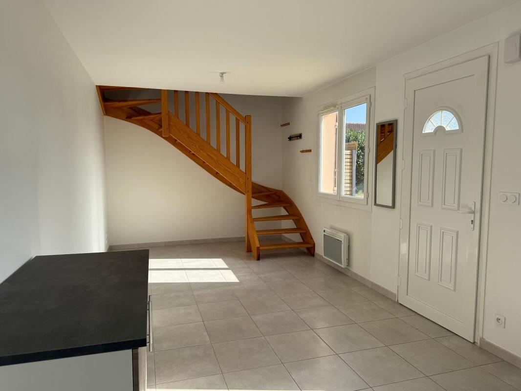 A louer, T2 bis en duplex, rénové récemment, composé au rez-de-chaussée, d'une pièce de vie principale avec cuisine aménagée et équipée et un cellier. A l'étage, une chambre avec placard, un bureau et une salle d'eau.