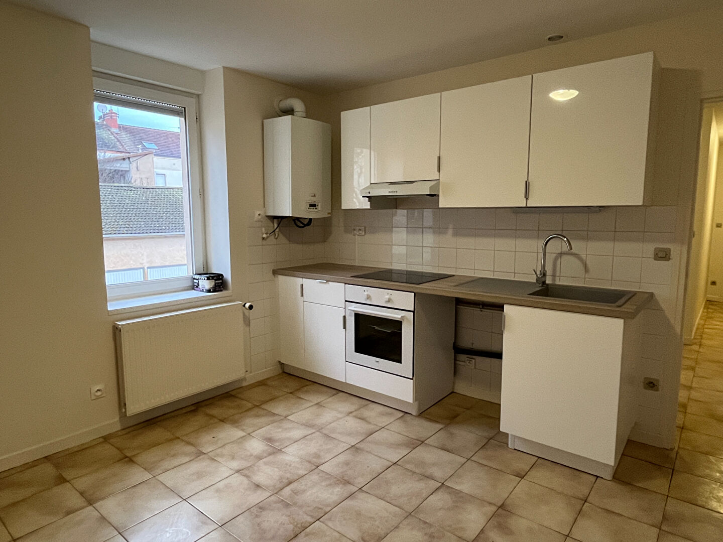 Rue Jean Bouveri - Appartement de 79m² env. en RDC, comprenant une entrée avec placard, une cuisine équipée (hotte, plaques de cuisson, frigo) ouverte sur le séjour, 3 chambres, salle d'eau avec douche extra plate, wc.