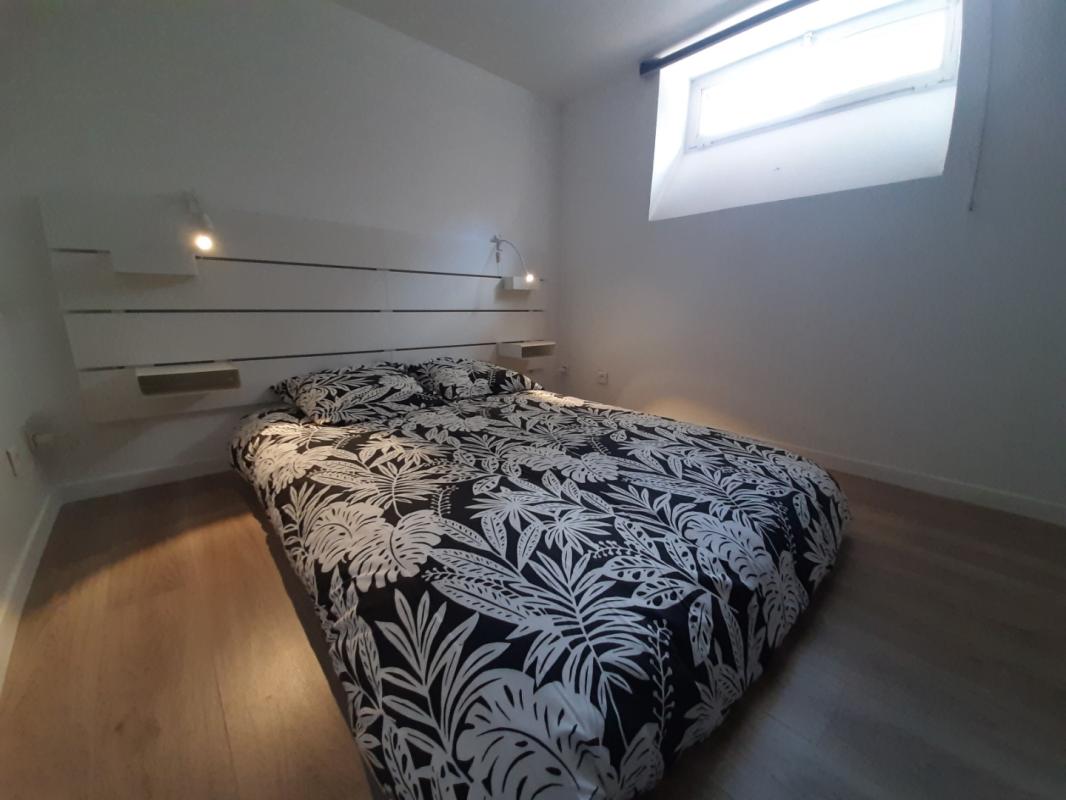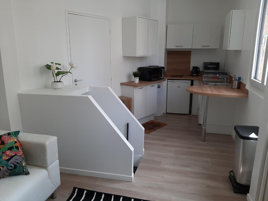 A louer, un charmant studio MEUBLE en souplex comprenant une pièce de vie avec un coin cuisine aménagée et équipée et une salle d'eau. Au niveau inférieur, une chambre. Logement entièrement équipé.