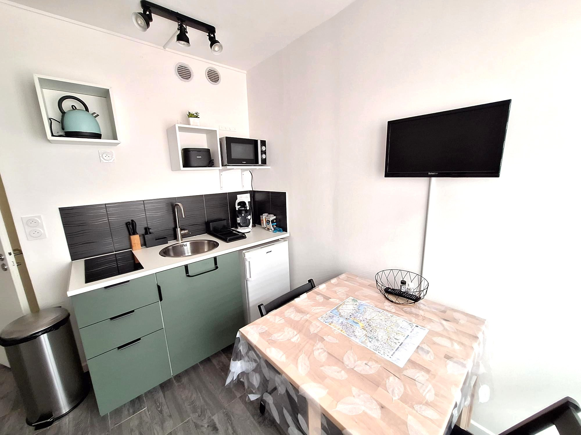 Studio meublé de tourisme 2 étoiles de 27m² situé à la Chaume au 3ème étage avec ascenseur. Il comprend un couloir avec un lit superposé de 90x190 pour 2 personnes et un placard. Le séjour/cuisine se compose ...