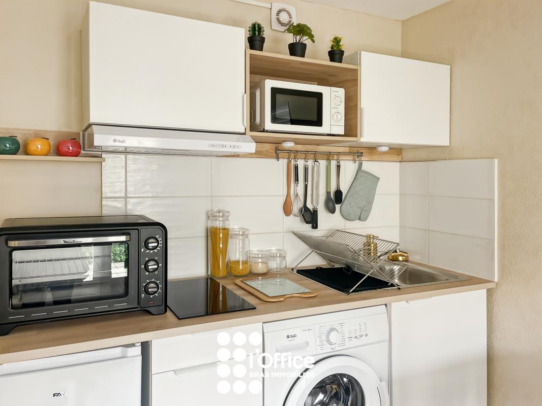 le studio comprend une pièce de vie avec lit 160x190 table chaise télévision meuble de rangement, ouvert sur la cuisine comprenant plaque de cuisson hotte micro-ondes, l...