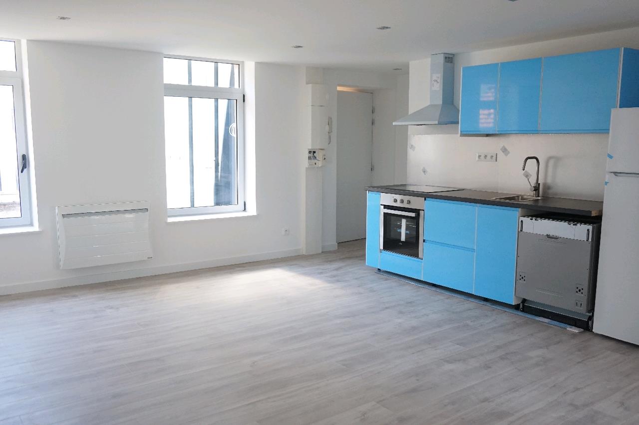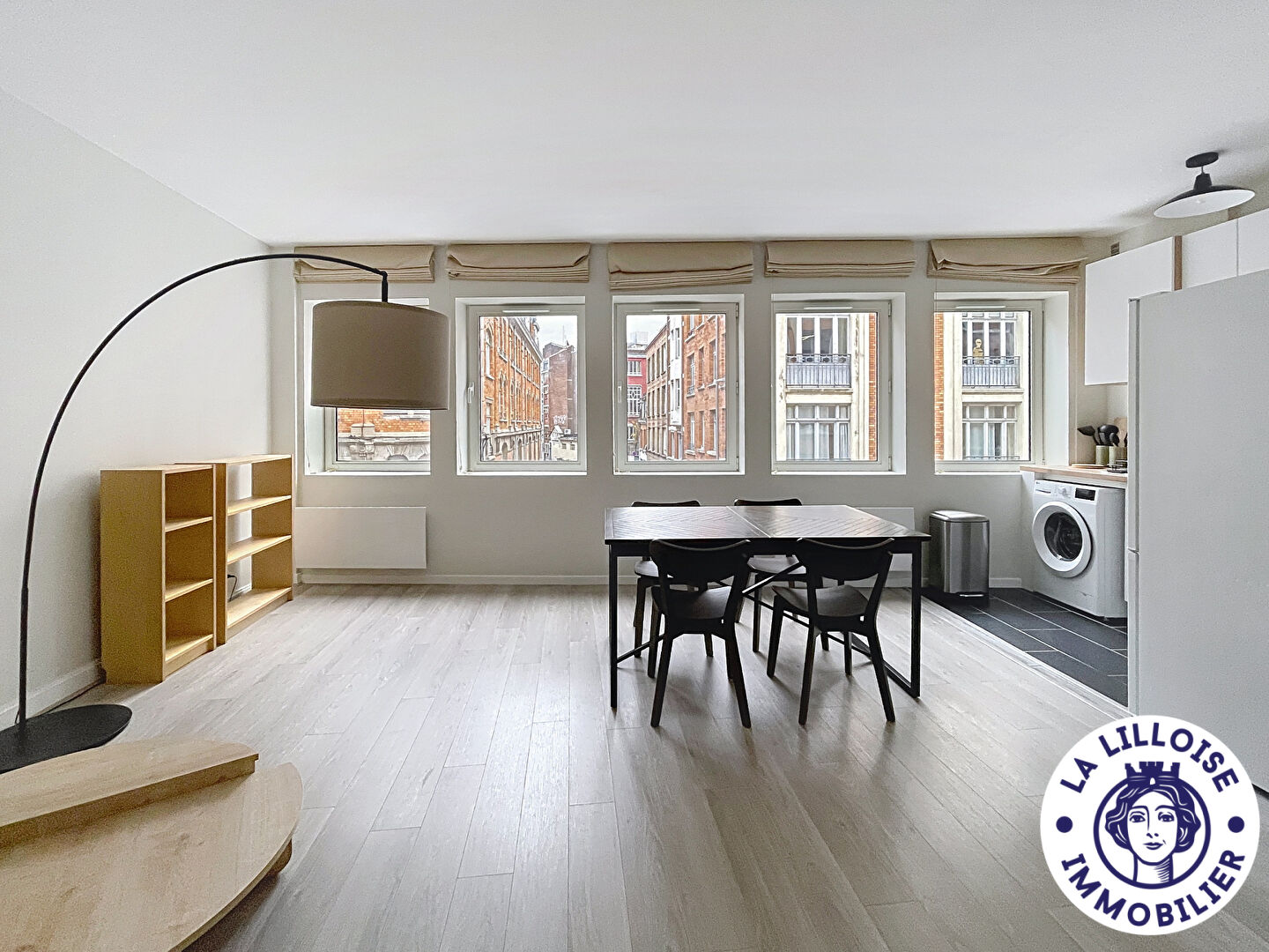 En plein coeur du vieux Lille. Beau T1Bis loué meublé de 39,80m² entièrement rénové, situé au 3ème et dernier étage. Entrée ouvrant sur un couloir avec WC séparé, grande pièce de vie de 24 m² avec poutres apparentes et cuisine américaine aménagée et toute équi...
