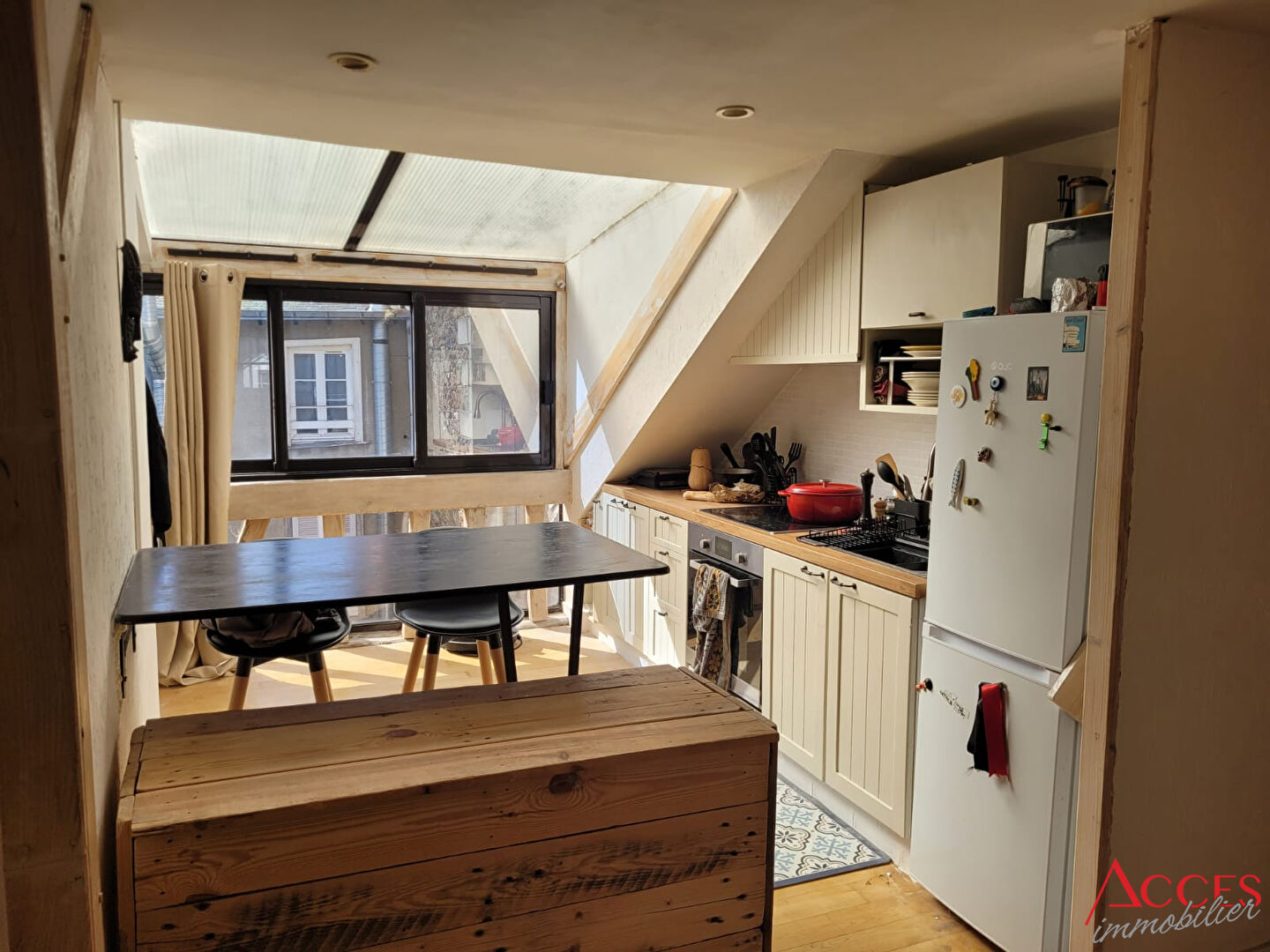 Place de la Barreyrette, charmant duplex à louer offrant entrée, séjour, cuisine, deux chambres, salle de bain, WC, mezzanine.