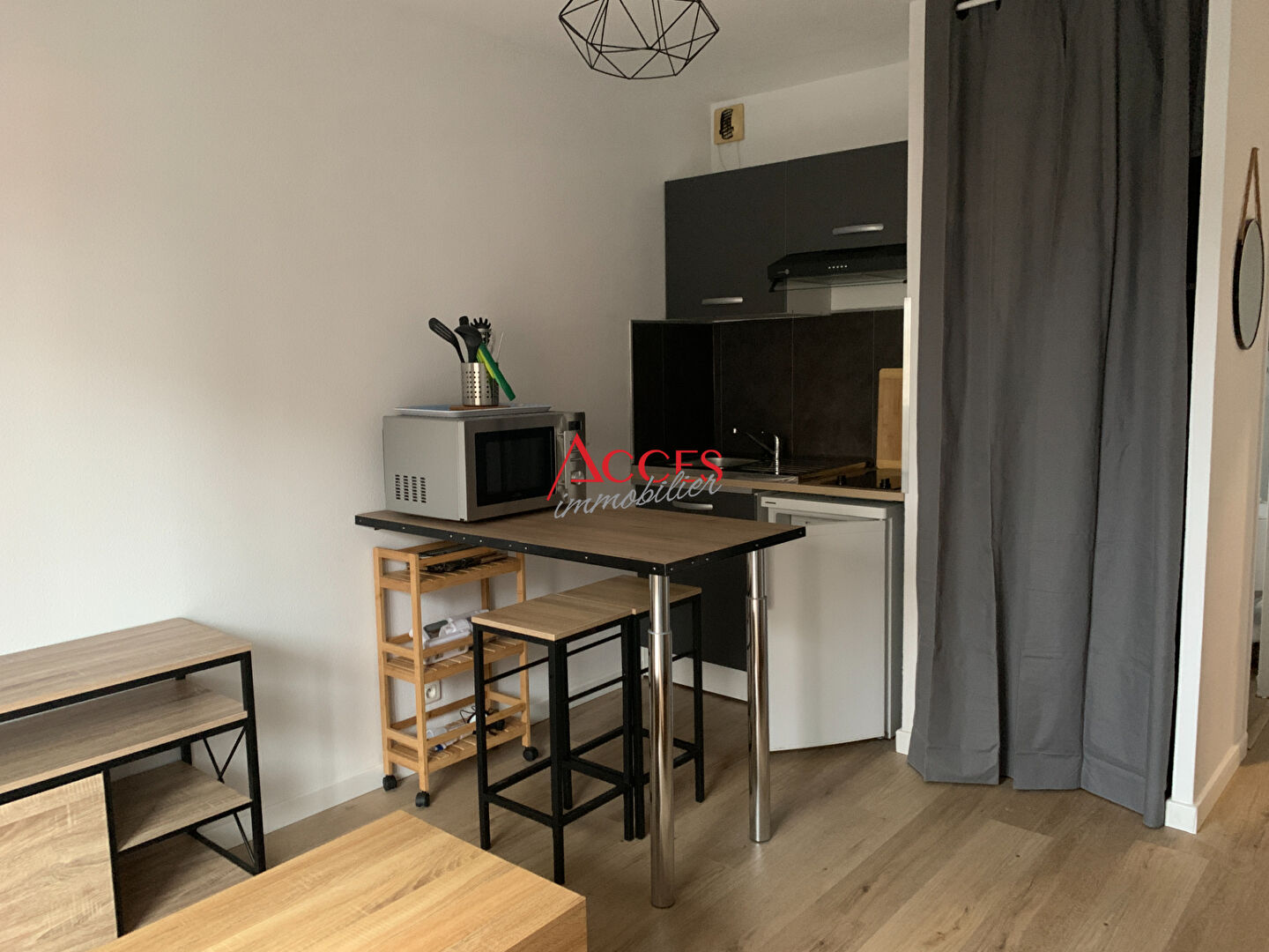 - 1 pièce principale avec coin cuisine (canapé + buffet)