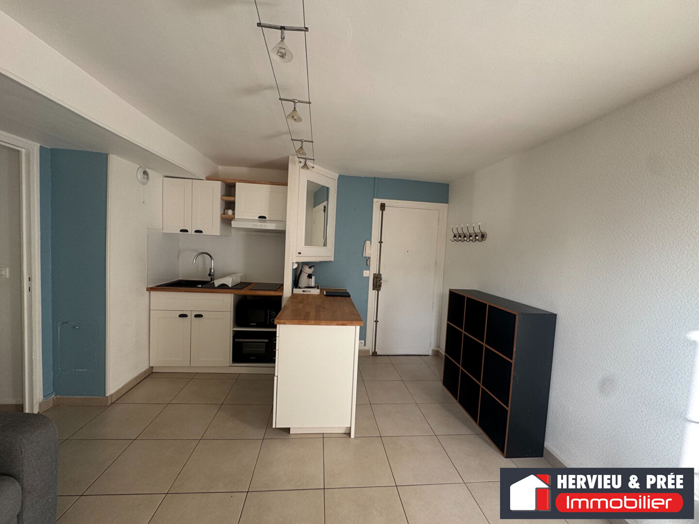 Location appartement deux pièces meublé situé au premier étage d'une résidence très proche plage. Il comprend : entrée donnant sur séjour et cuisine ouverte, salle de douche avec wc, chambre avec placard.