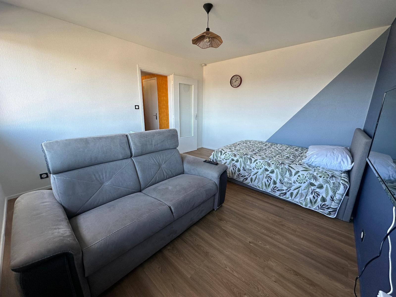 Granville, proche commerces, Studio meublé de 35.34m² au 2 nd étage d'une résidence sécurisé sans ascenseur, comprenant entrée avec placard, belle piece de vie avec cuisine aménagée et équipée, espace nuit, salle de bain avec wc.