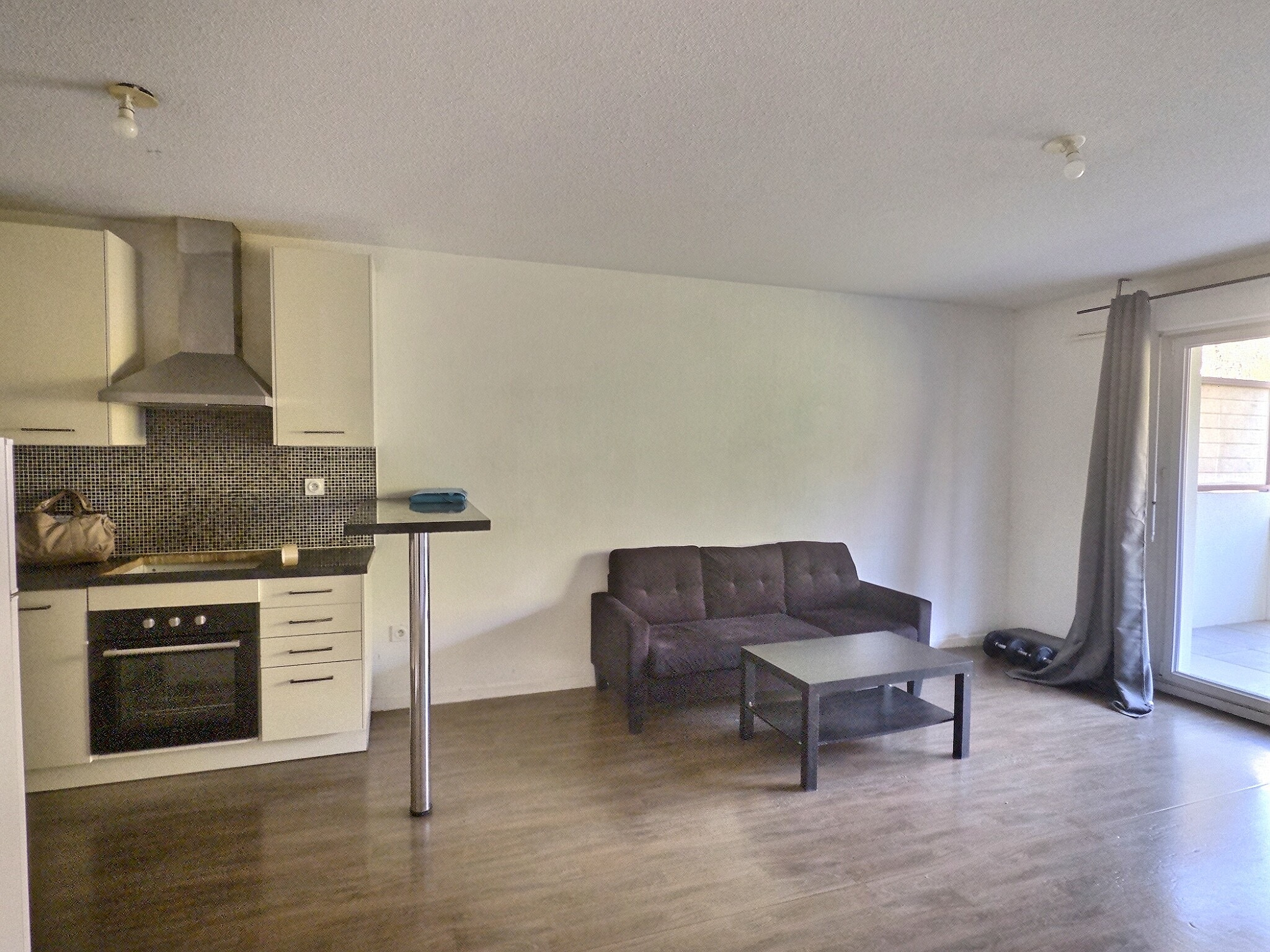 Charmant Studio Meublé - RUE CHAPE - composé : un hall avec placard, une salle d'eau, une cuisine ouverte sur le séjour climatisé et une terrasse.
