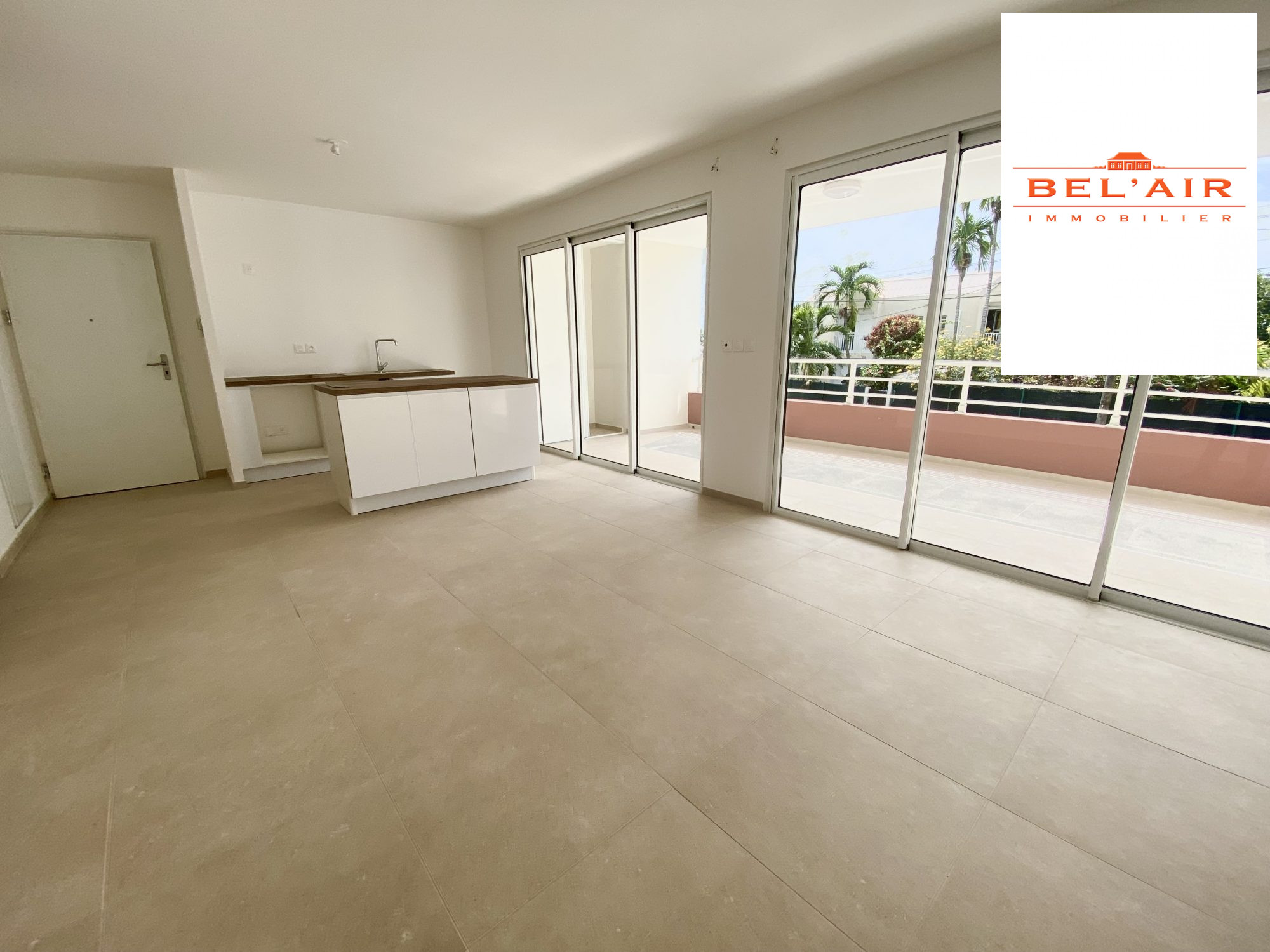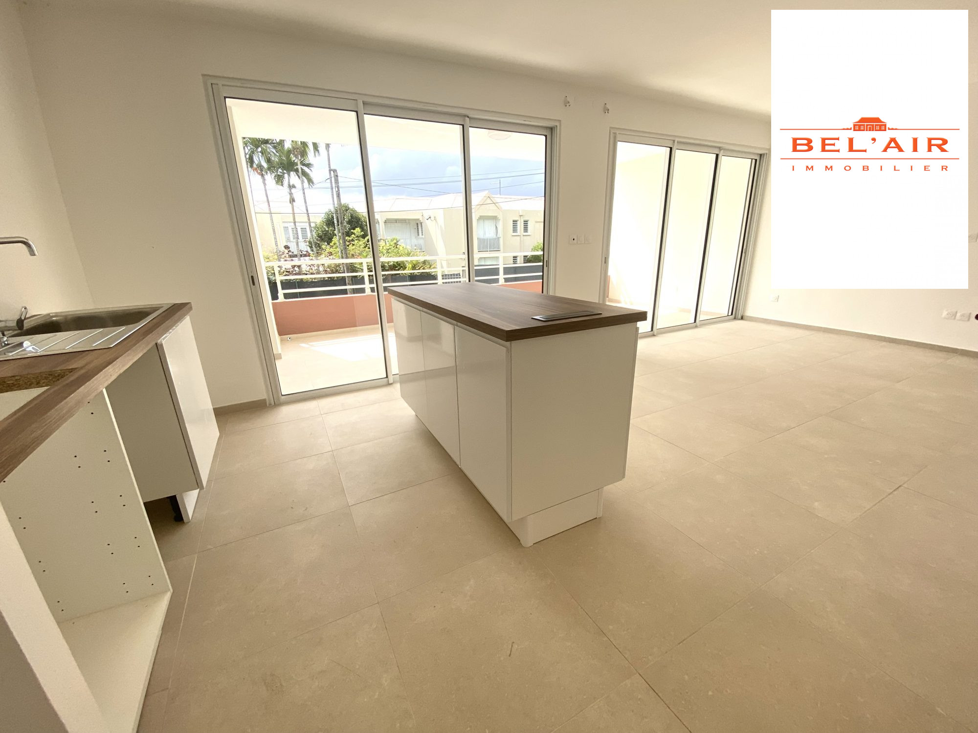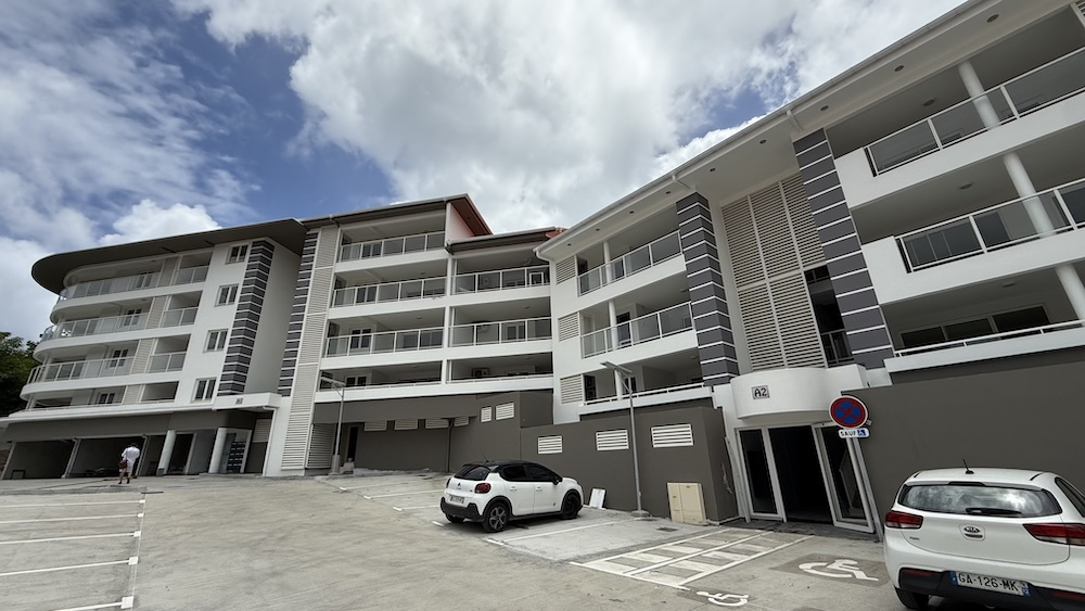 FORT DE FRANCE : Dans une résidence neuve, très bel F3 de 80 m² (y compris terrasse) : salon, cuisine ouverte aménagée et équipée (plaque de cuisson), deux chambres climatisées, une salle d'eau et un wc indépendant. Terrasse couverte.