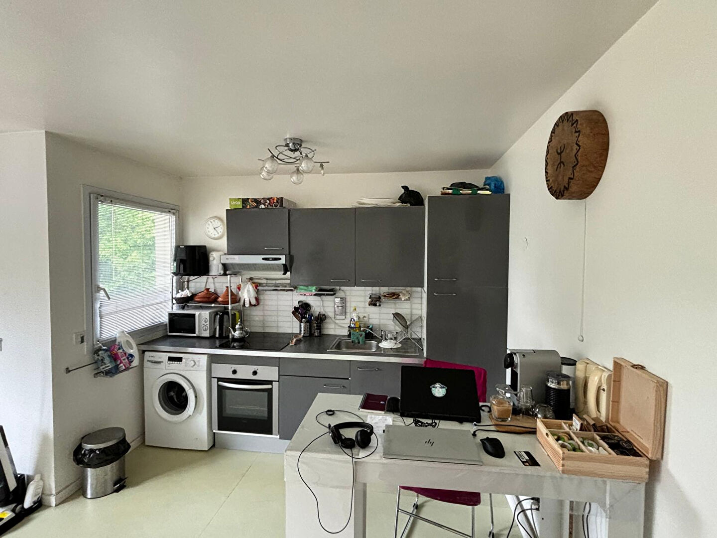Grand séjour double de 37m2 avec cuisine aménagée équipée séparée reliée par une verrière.