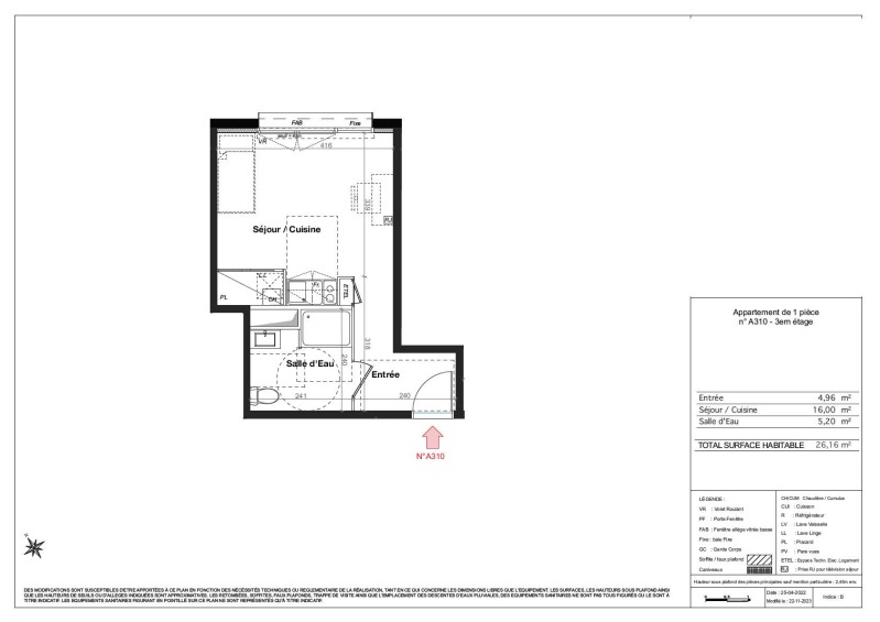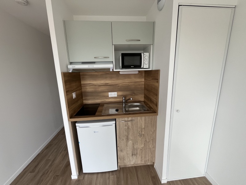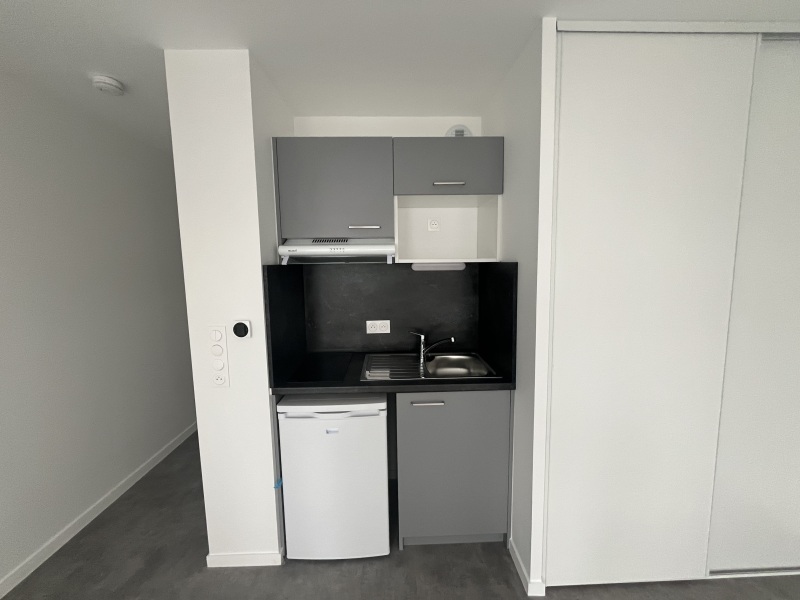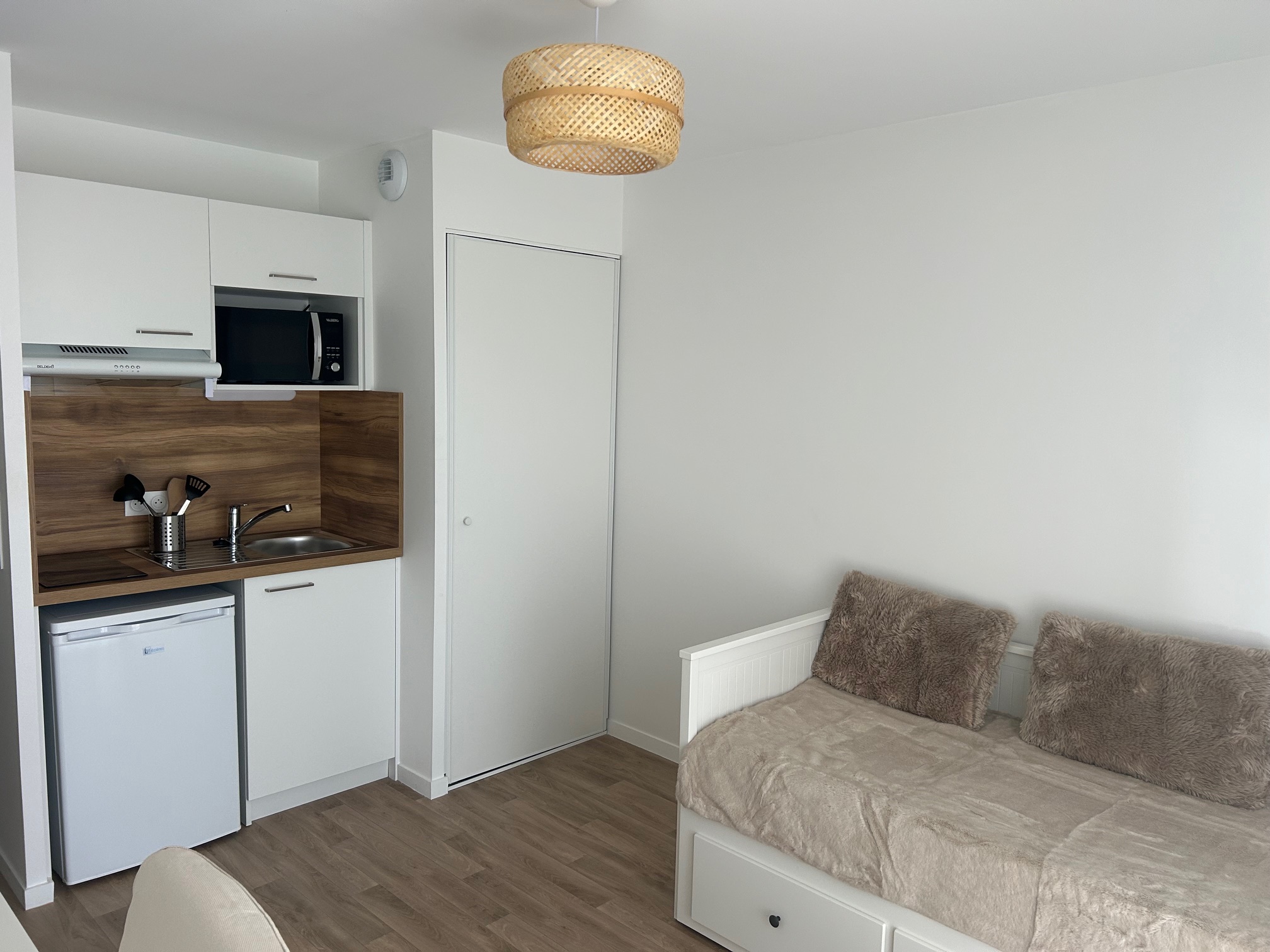 Mérignac Centre - Appartement neuf - Studio meublé de 23 m² comprenant : <BR>Une pièce principale fonctionnelle avec coin nuit et espace bureau, une cuisine toute équipée (plaques, frigo, micro-ondes, rangements), une salle d'eau moderne avec douc...