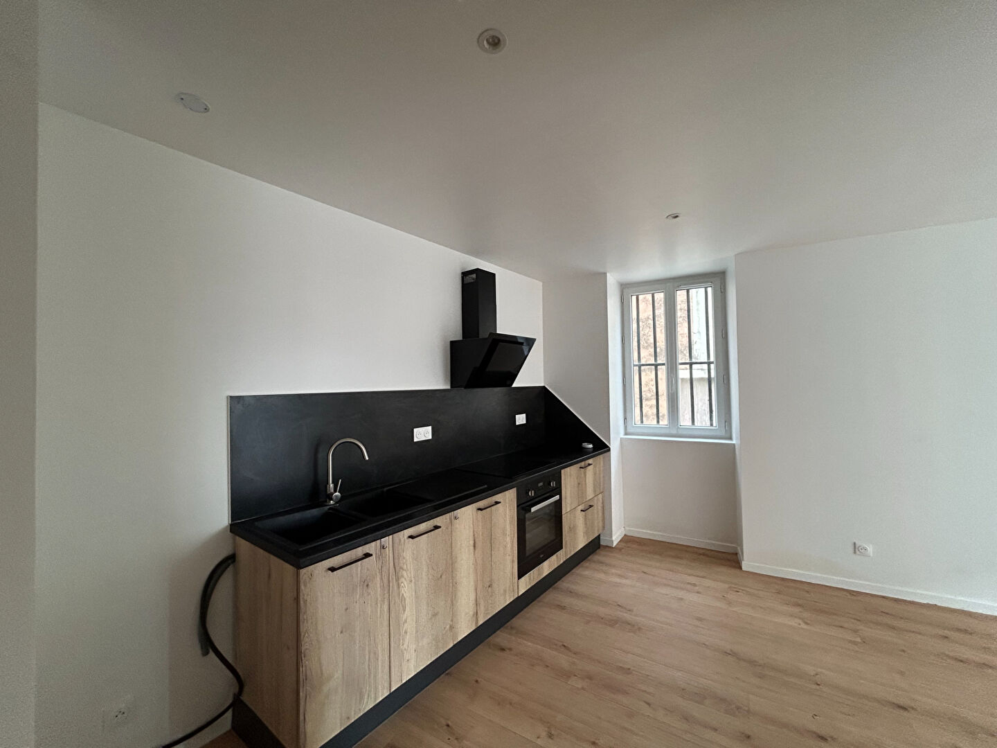 Appartement T3 situé au rez-de-chaussée, comprenant un salon, une cuisine aménagée et équipée (plaques, hotte, four), deux chambres et une salle d'eau avec WC.