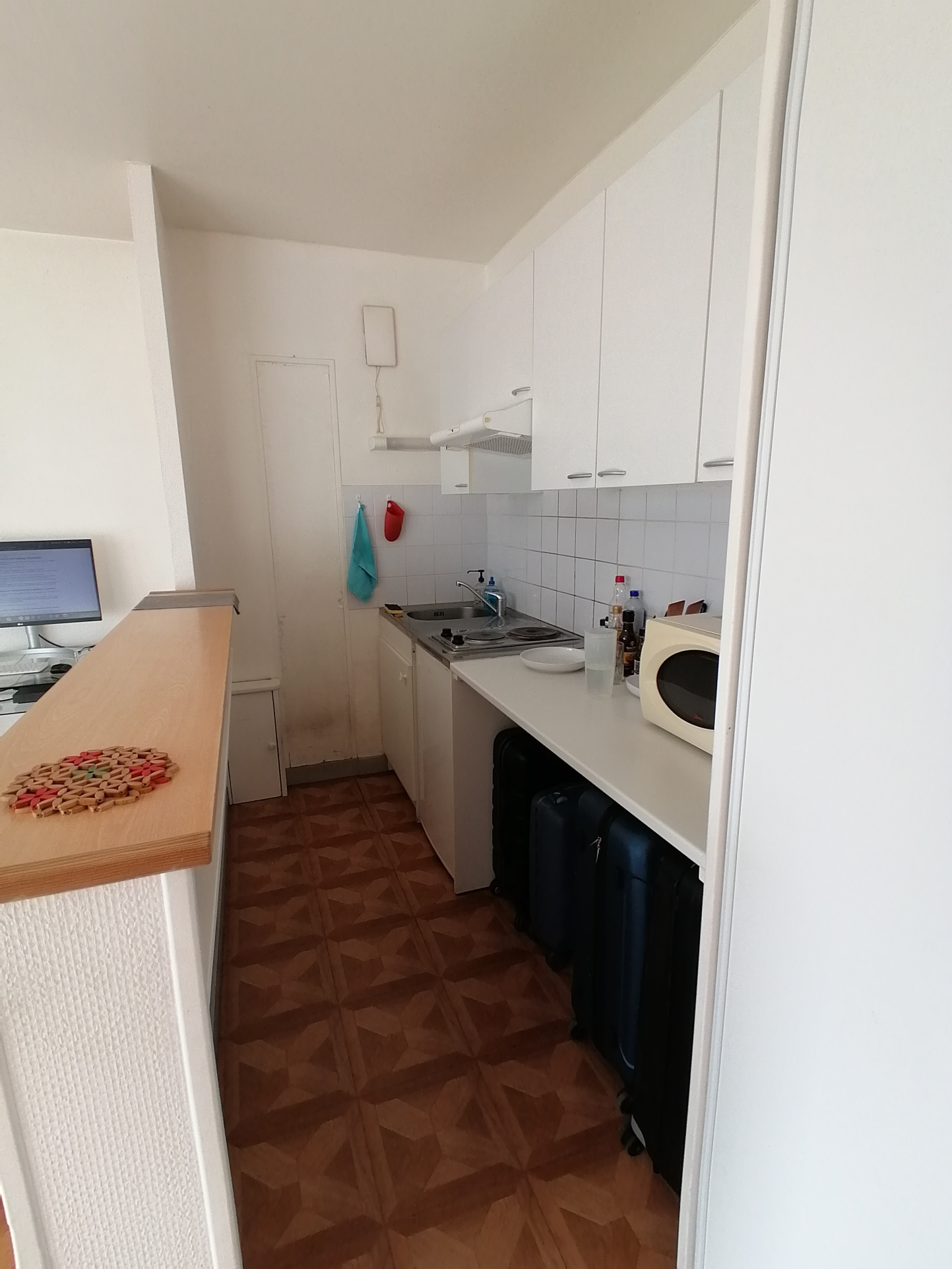 Entrée, depuis une coursive extérieure, sur pièce de vie avec coin cuisine, & salle d'eau avec wc