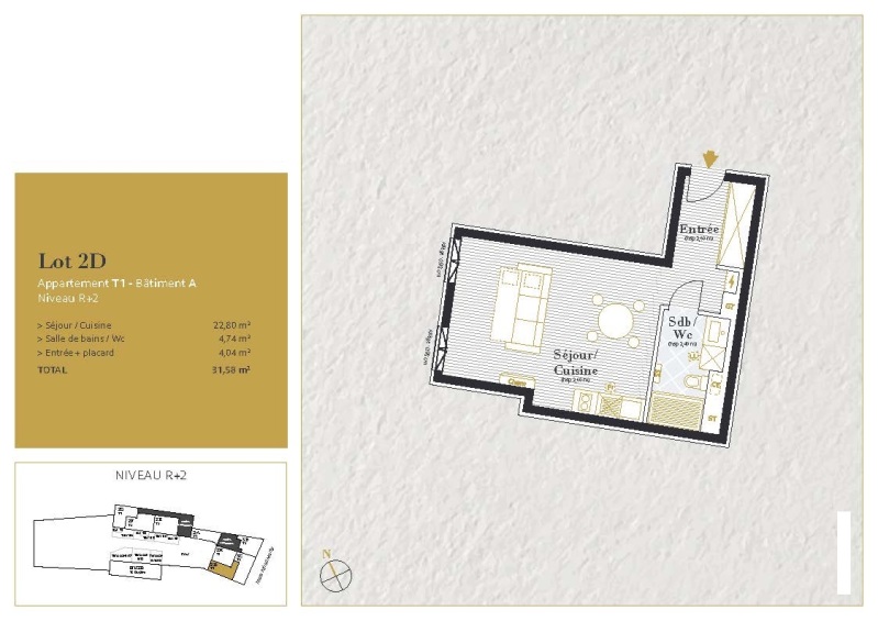 L'appartement comprend une entrée, une pièce de vie avec coin cuisine, une salle d'eau avec wc.