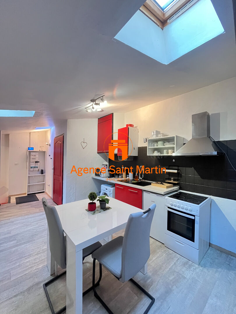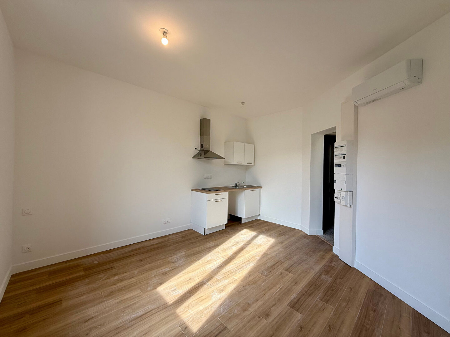 Une chambre avec rangement, cuisine aménagée et équipée plaque, four, hotte donnant sur une pièce de vie. Salle d'eau, ...