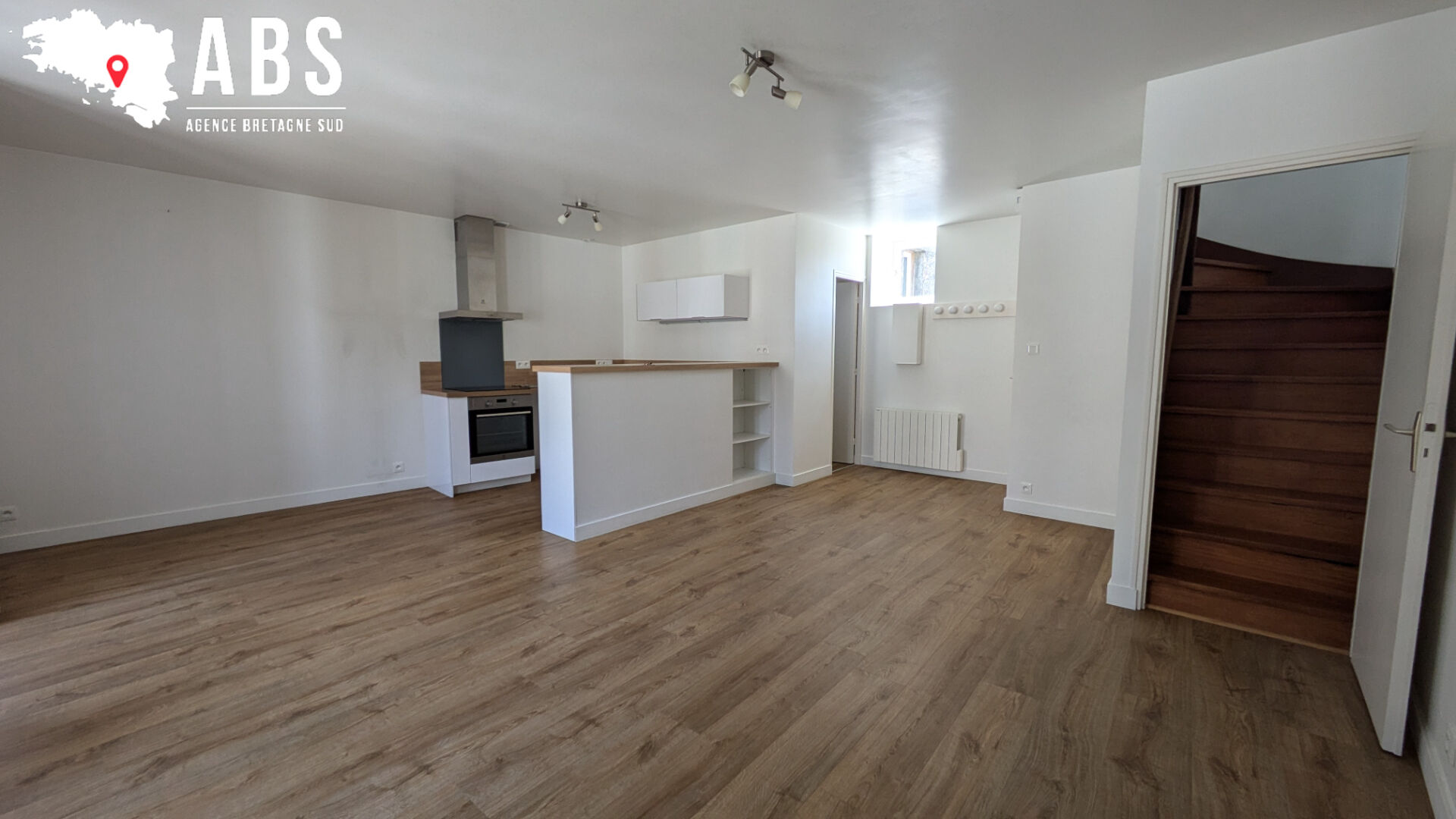 Centre ville de PLOERMEL, appartement T3 d'environ 54 m² offrant au rez-de-chaussée séjour avec coin cuisine aménagée et équipée (hotte et plaques), WC. A l'étage; 2 chambres, salle d'eau, WC.