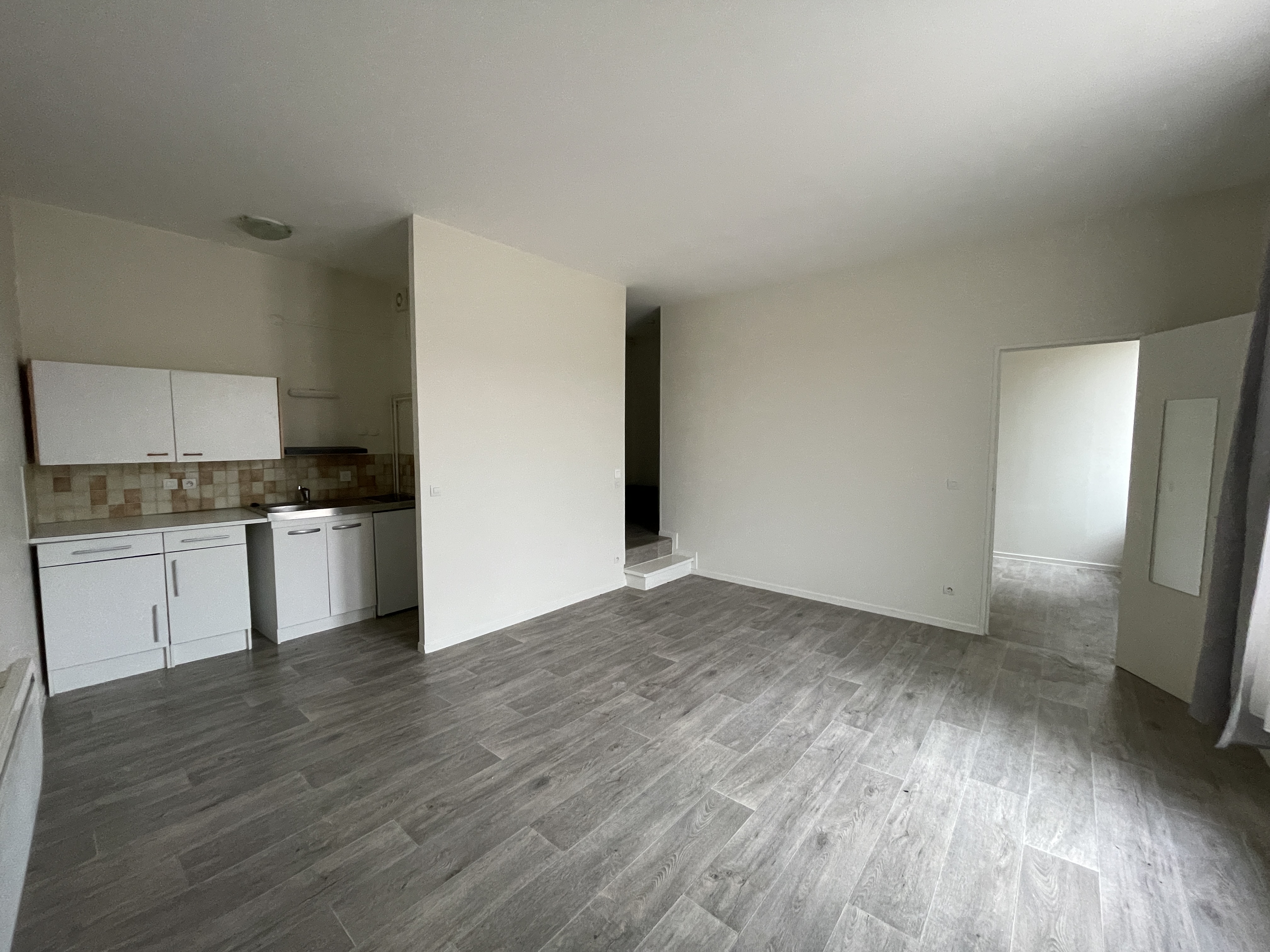 Appartement de type F3 dans une petite copropriété comprenant une entrée, un séjour, une cuisine aménagée et équipée, deux chambres une salle de bains et un WC individuel. Un escalier dans le séjour donne accès à une mezzanine.