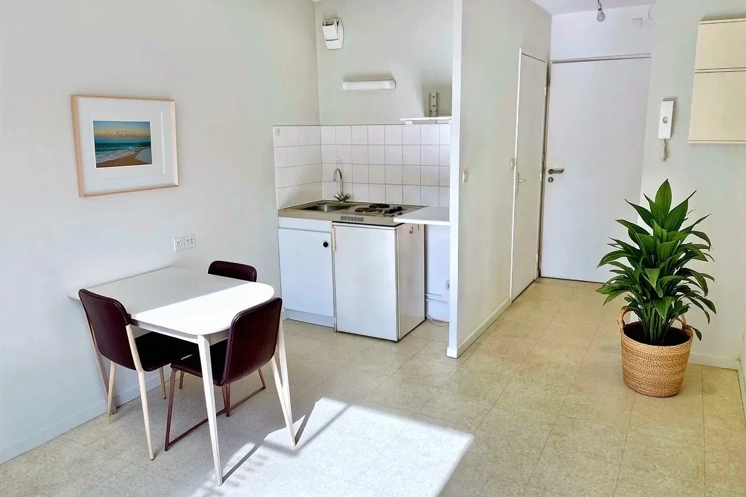 Dans une résidence sécurisée avec gardien, studio meublé de 17.85m² offrant une pièce de vie avec cuisine ouverte équipée (réfrigérateur, plaque de cuisson, micro-o...