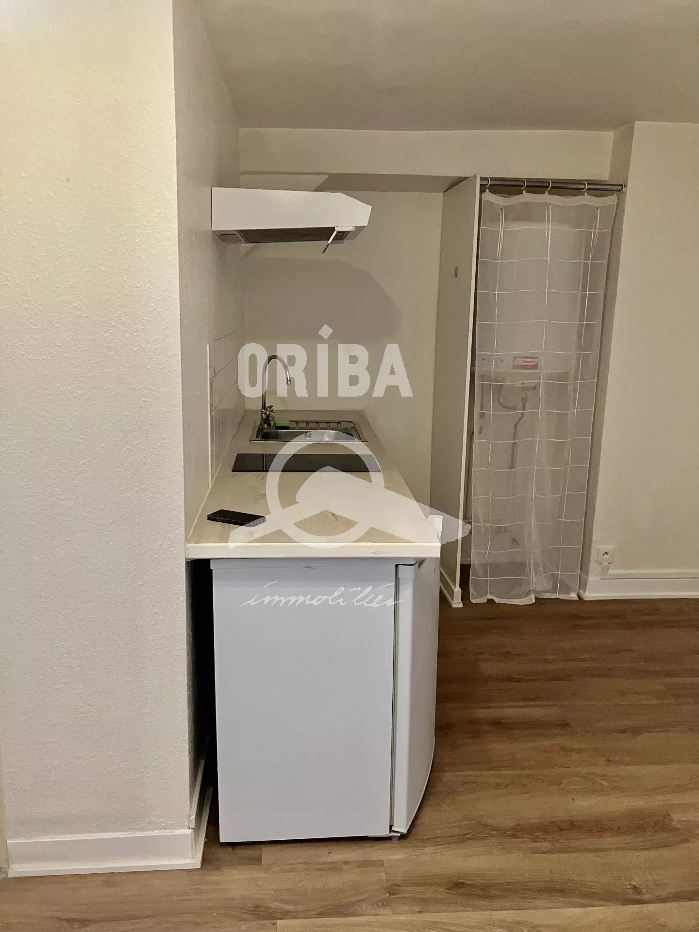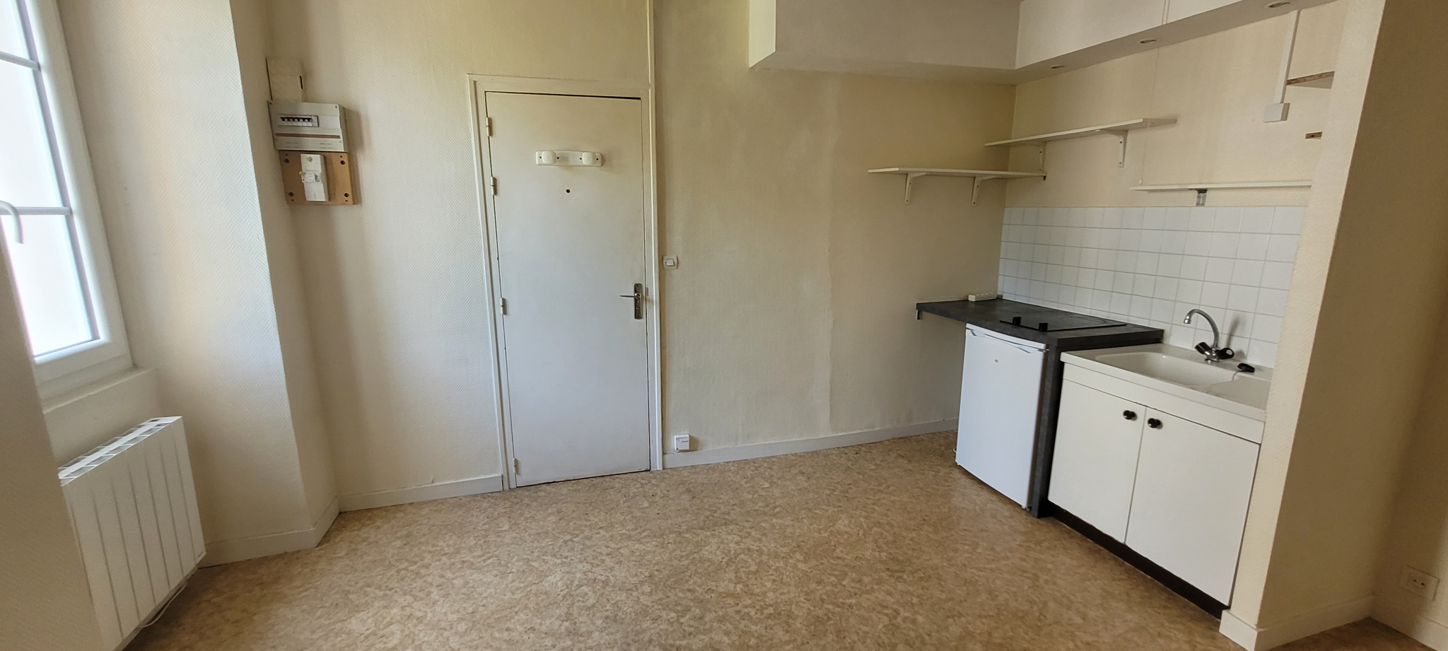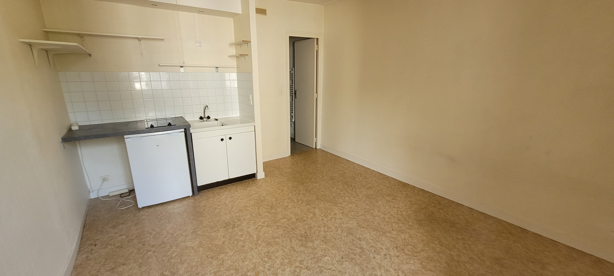 Appartement STUDIO au 3ème étage d'une surface habitable de 18.95 m² composé de : pièce de vie avec kitchenette équipée d'évier, plaques électriques, réfr...