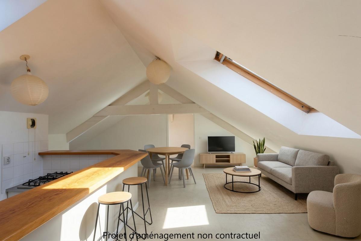 NANTES - CENTRE VILLE. A deux pas de la Place Talensac, appartement de type 3 pièces avec poutres apparentes, comprenant : une entrée avec placard, un séjour de 23 m² avec coin cuisine séparé par un meuble bar, deux chambres mansardées, une salle de bain, un ...