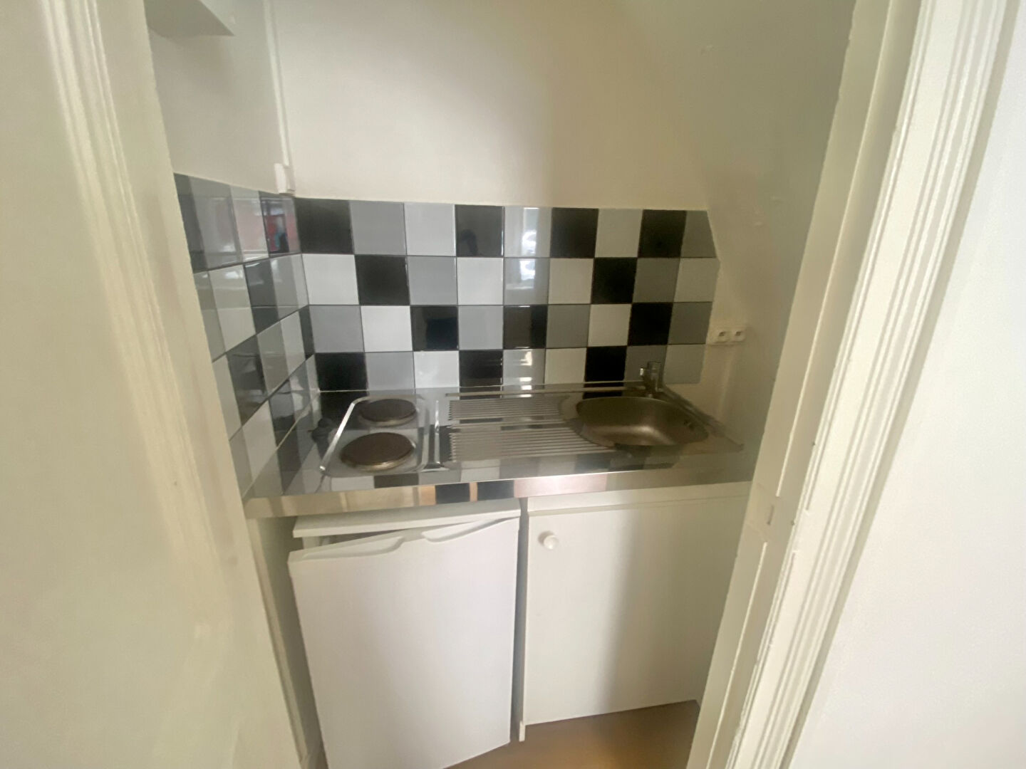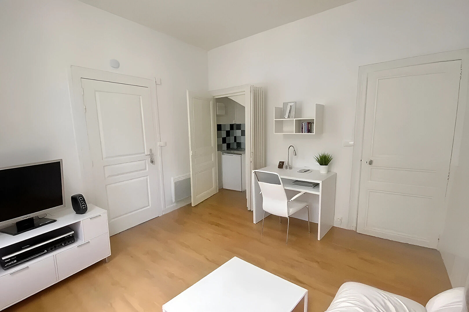 Rue Voltaire - Dans un immeuble de 1940, appartement de type 1 MEUBLÉ de 13.85 m² situé au 3ème et dernier étage avec ascenseur et comprenant : une pièce principale avec kitchenette équipée (plaques de cuisson et réfrigér...