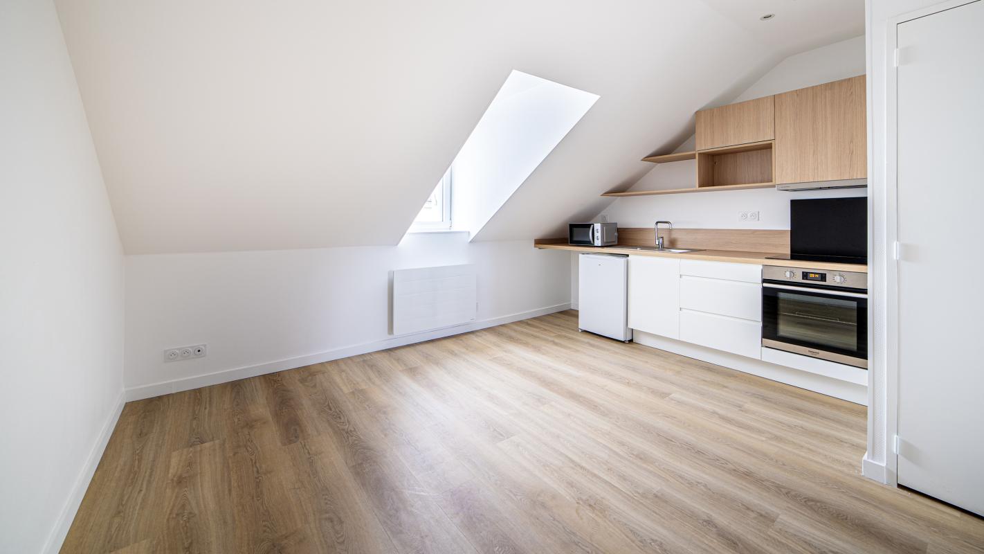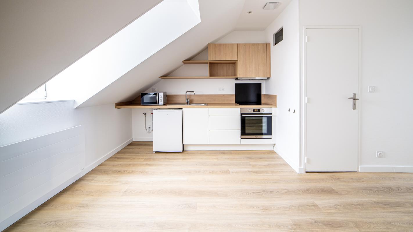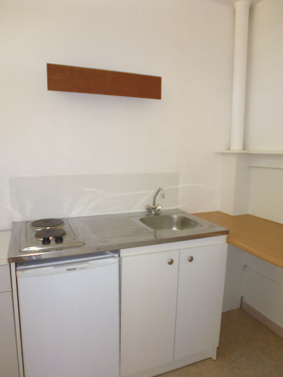 Rue Jean Jaurès - Au 3ème et dernier étage, ce studio meublé comprend une pièce de vie avec cuisine aménagée et équipée (plaques électriques, frigo, machine à laver), et une salle d'eau avec WC.