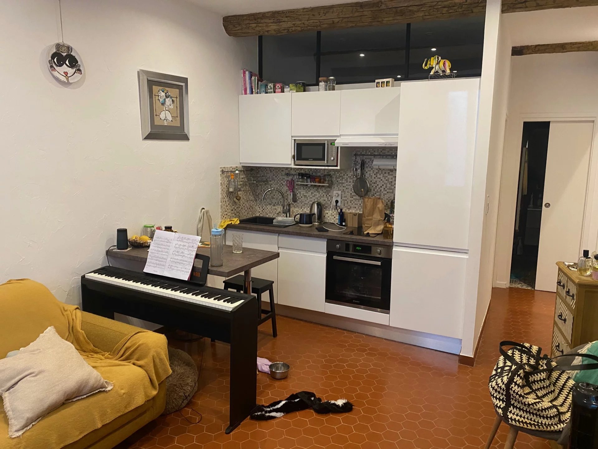Deux pièces en bon état composé d'un séjour avec une cuisine ouverte, d'une salle de bains avec WC et d'une chambre. Grands Rangements