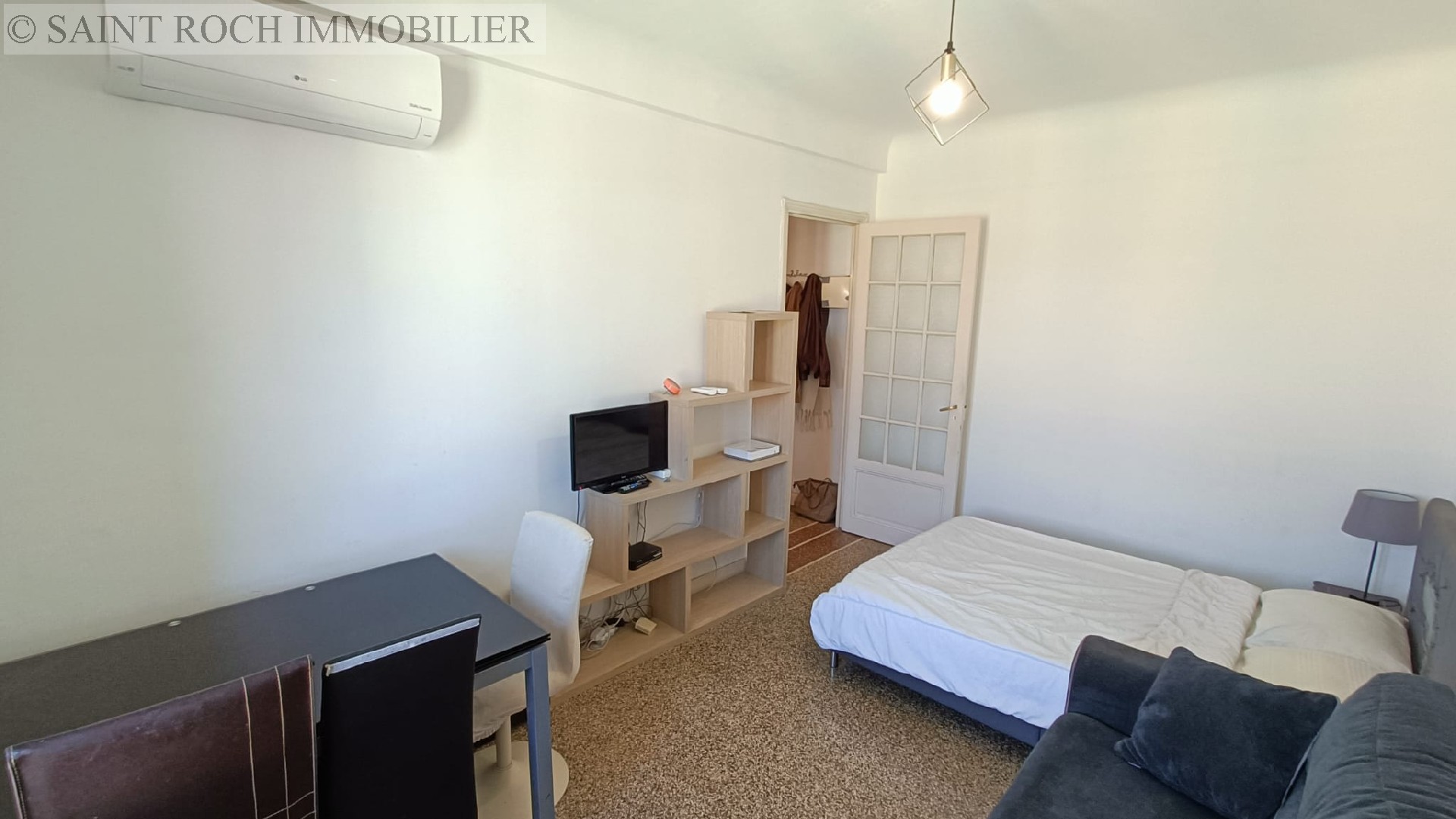 Joli studio meublé avec mezzanine, situé au 4ème et dernier étage sans ascenseur, entièrement rénové avec gout et climatisé, disponible en location longue durée, libre immédiatement.