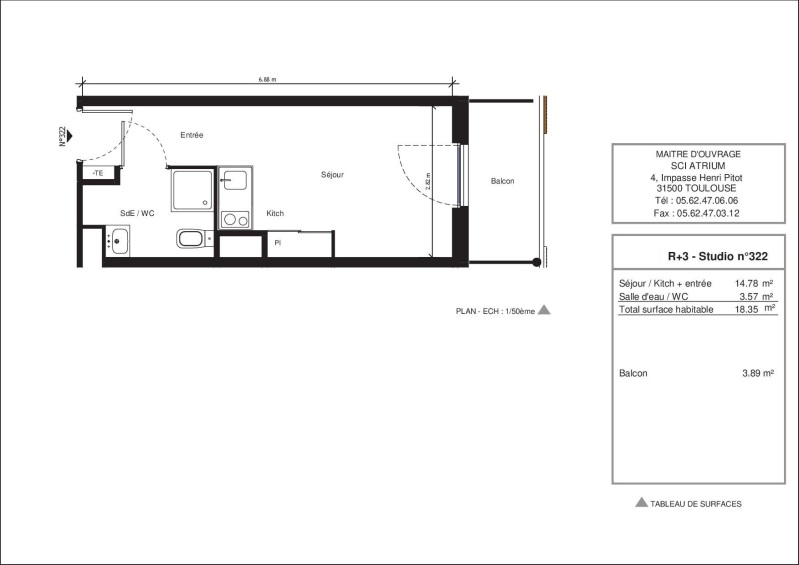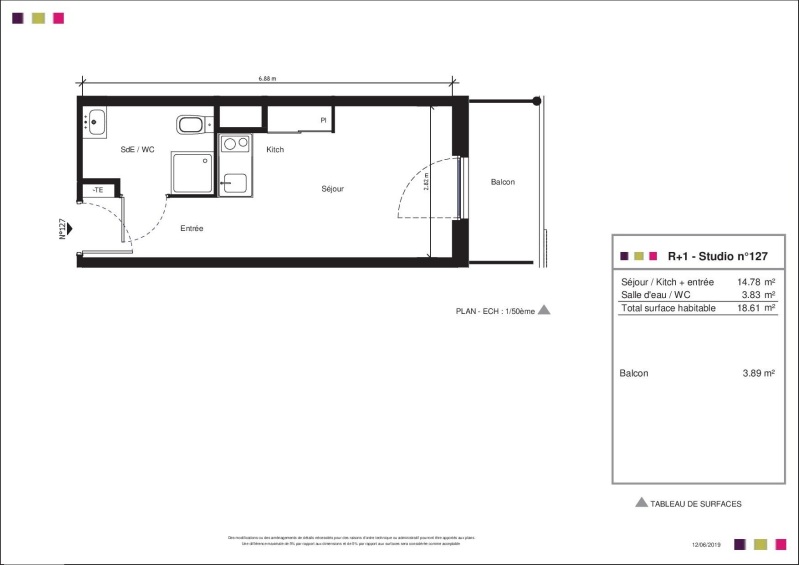 Ce studio comprend un séjour avec coin cuisine équipée ouvert sur balcon et une SDE avec wc.