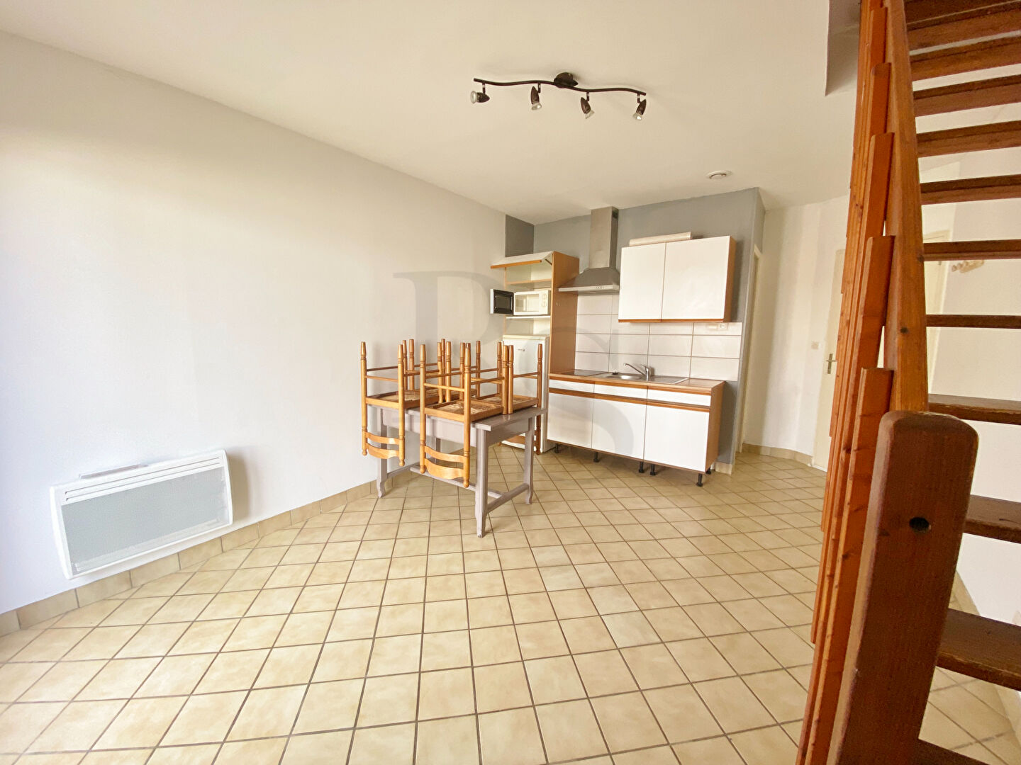 Cet appartement dispose d'une pièce de vie avec une mezzanine faisant office de chambre, une cuisine aménagée et équipée (gazinière, réfrigérateur), une salle d'eau et des WC séparés.