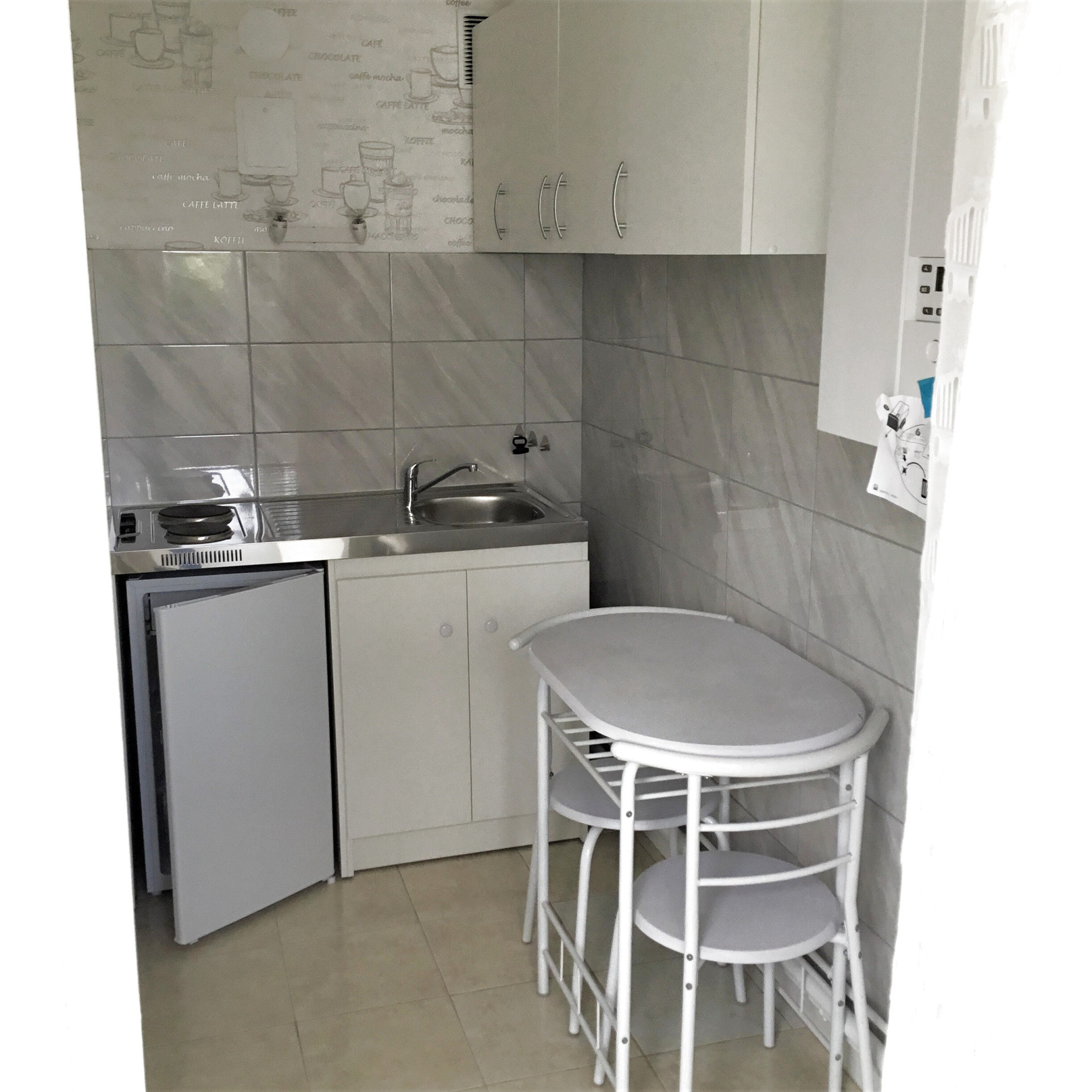 Pièce à vivre - Cuisine avec plaques de cuisson, réfrigérateur, micro-ondes- Salle d'eau