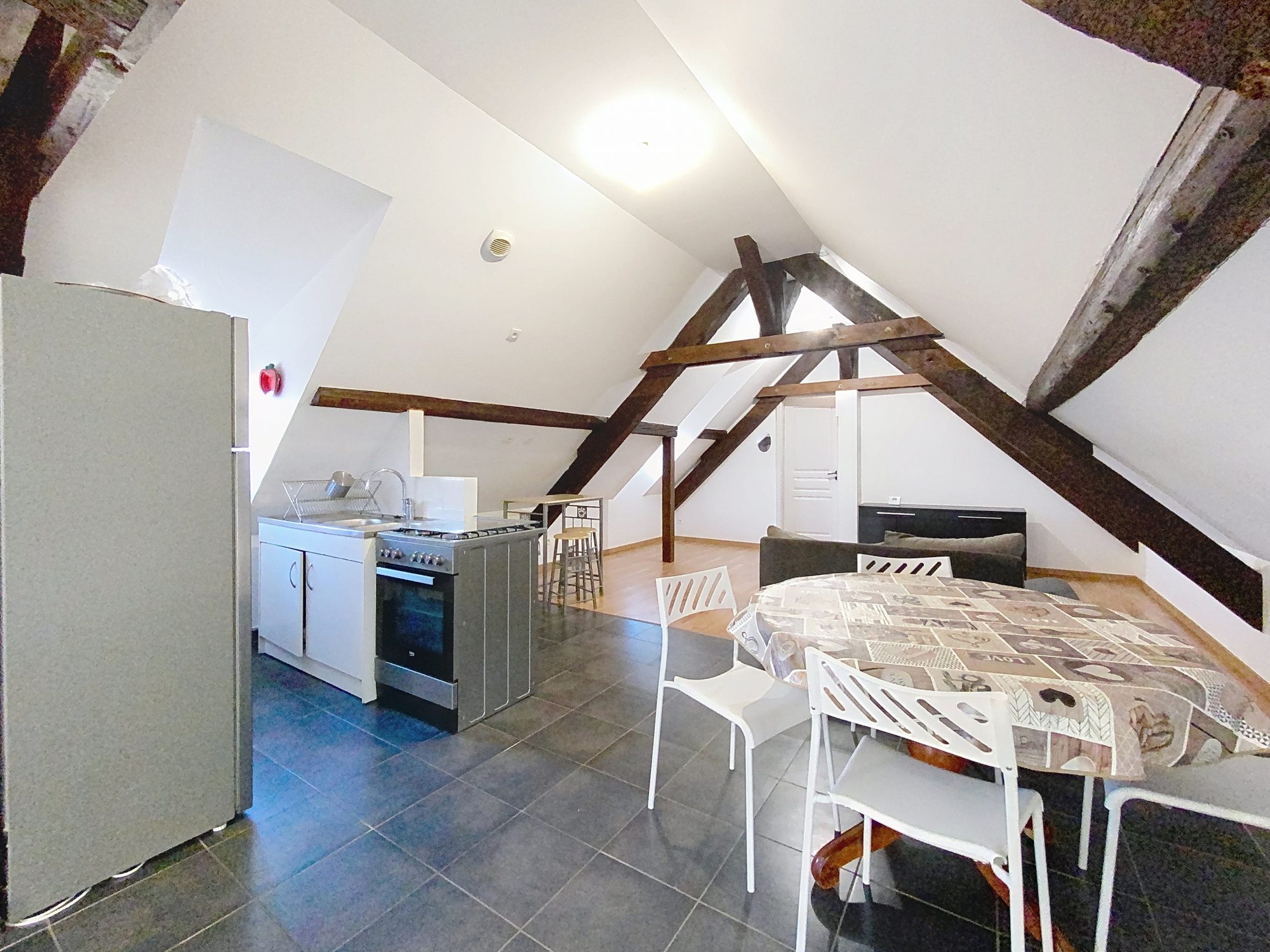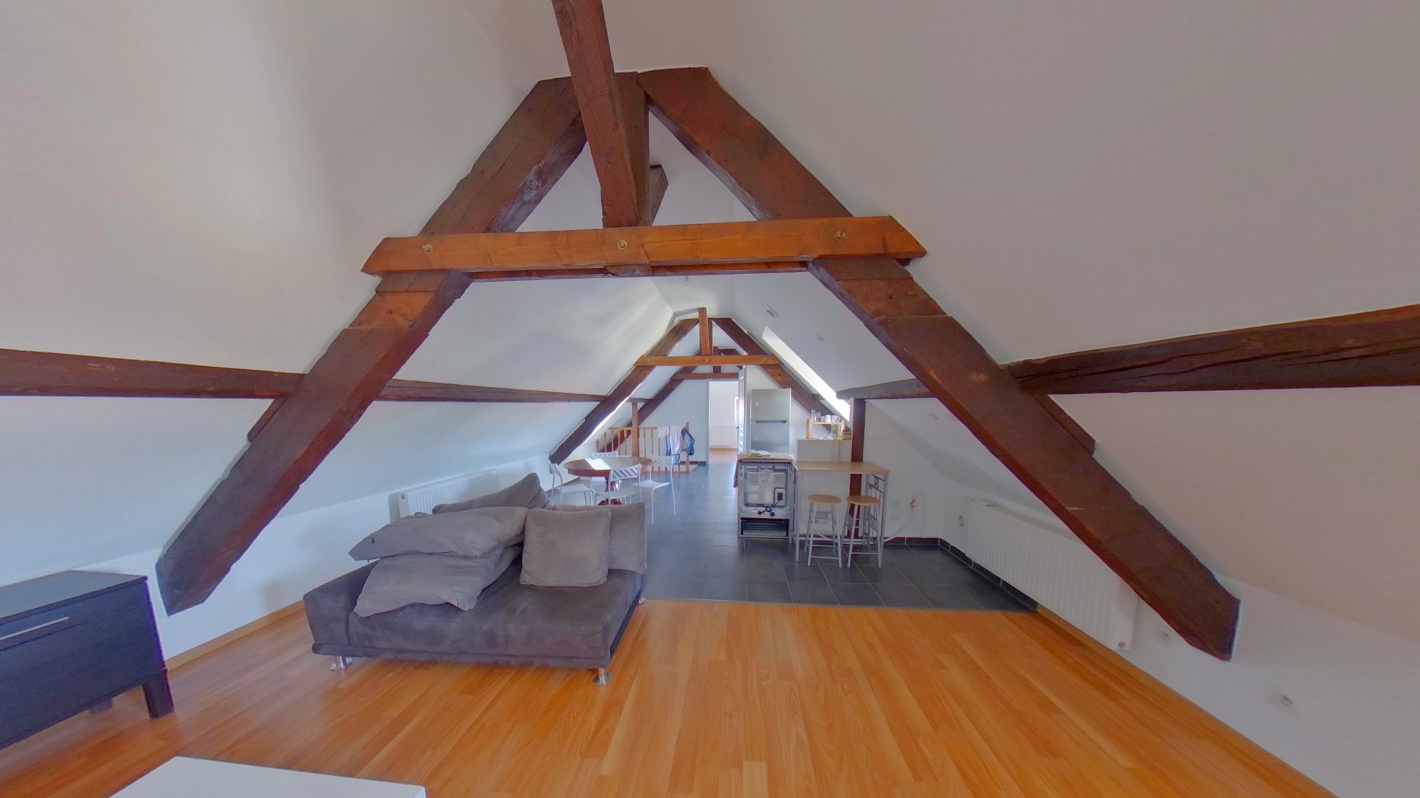 OBERSCHAEFFOLSHEIM - Rue du Général de Gaulle - Appartement 3 pièces MEUBLE de 50m² habitables, situé au dernier étage d'un petit immeuble, comprenant : une entrée carrelée avec une cage d'escalier donnant sur un séjour, un coin cuisine équipée, 2 ch...