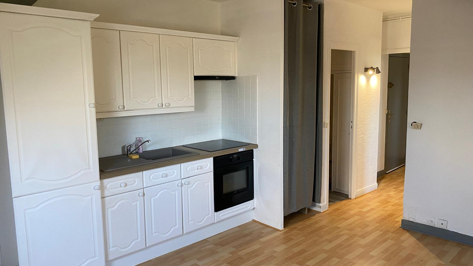 En centre-ville, appartement F2 au 1er étage comprenant : entrée sur escalier privatif, séjour avec cuisine ouverte aménagée et semi équipée, une chambre et salle de bains. Libre.