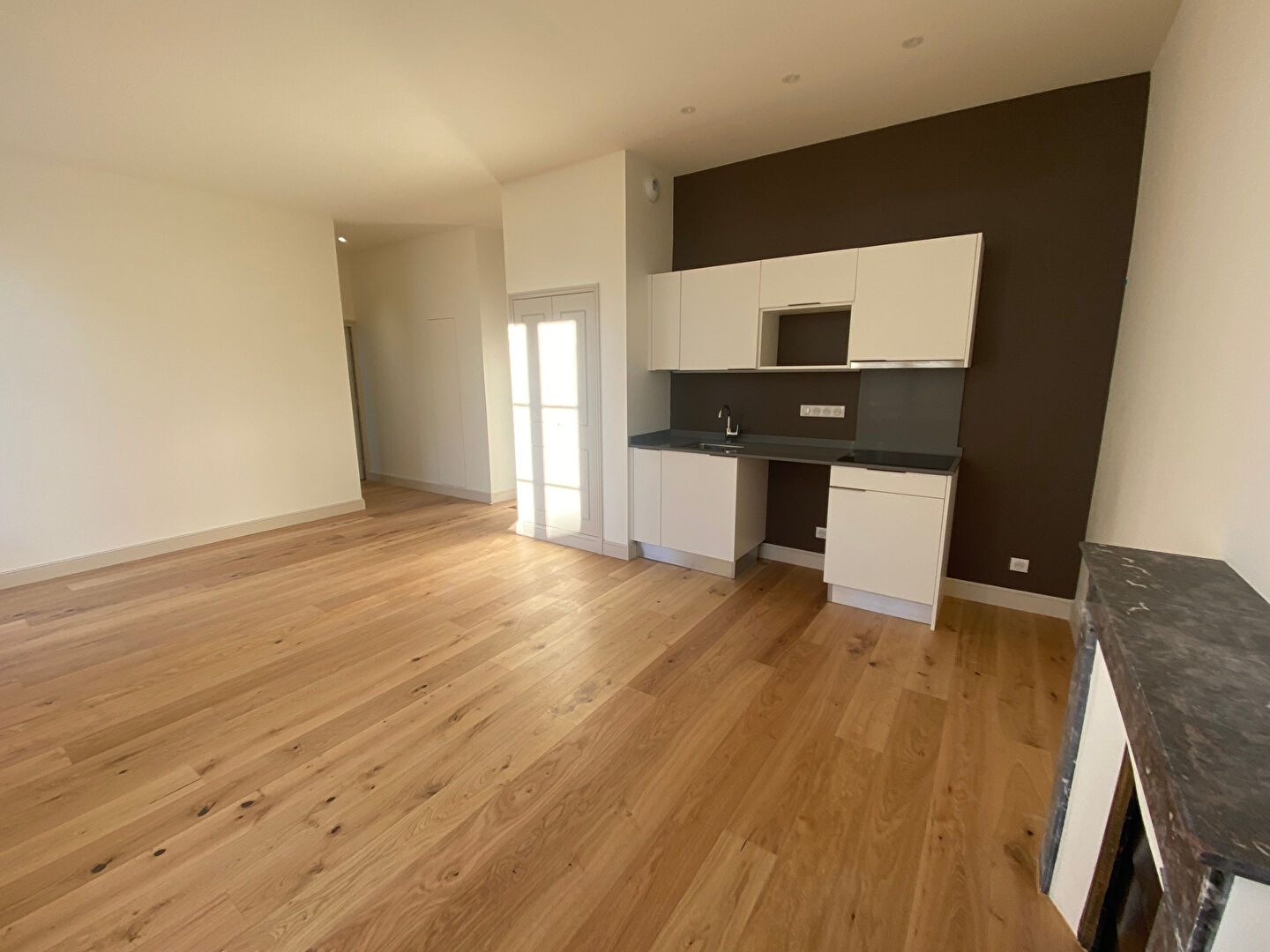 Entrée avec placards, salon avec balcon, une grande cuisine, une chambre,