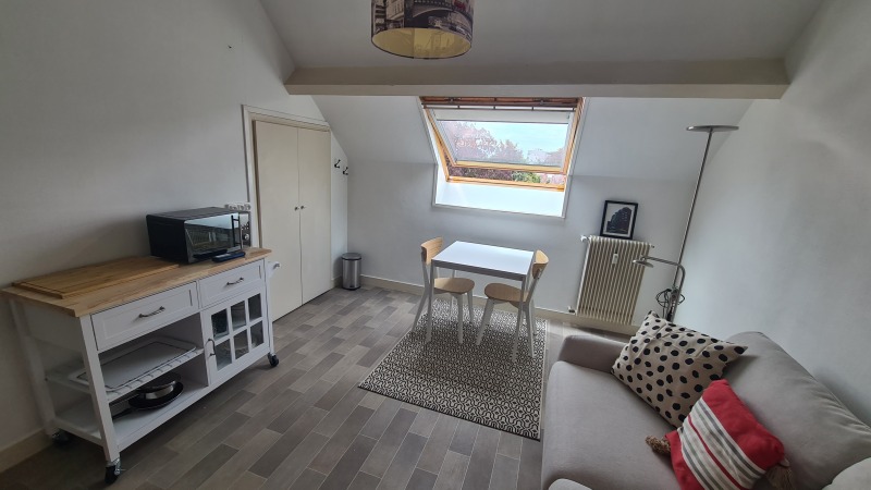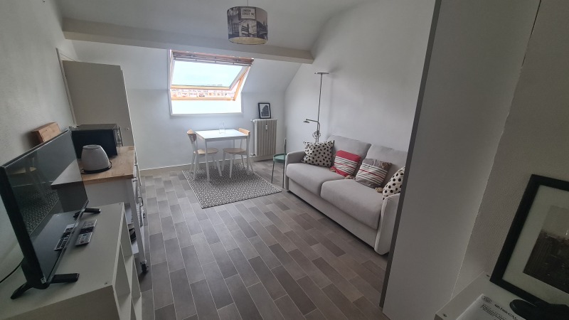 ORLEANS - QUARTIERDUNOIS Joli studio meublé situé dans une résidence calme, résidentielle et sécurisée, au dernier étage avec ascenseur, comprenant : un séjour avec canapé-lit convertible, meuble avec TV, table pour repas, armoire... coin kitchenette. Place de...