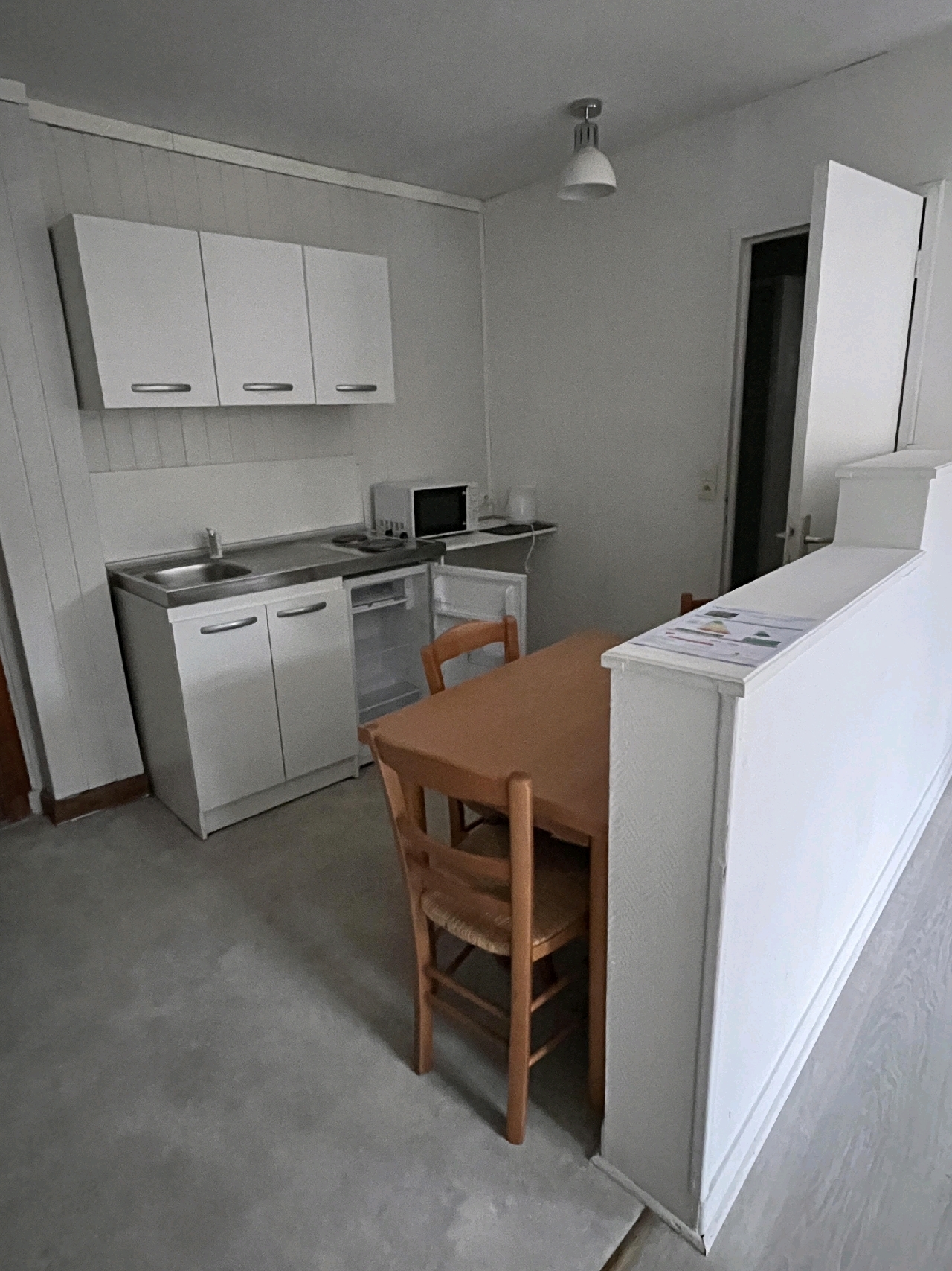 Un appartement comprenant une cuisine aménagée, une chambre avec un clic clac, une salle d'eau avec WC. Chauffage électrique.