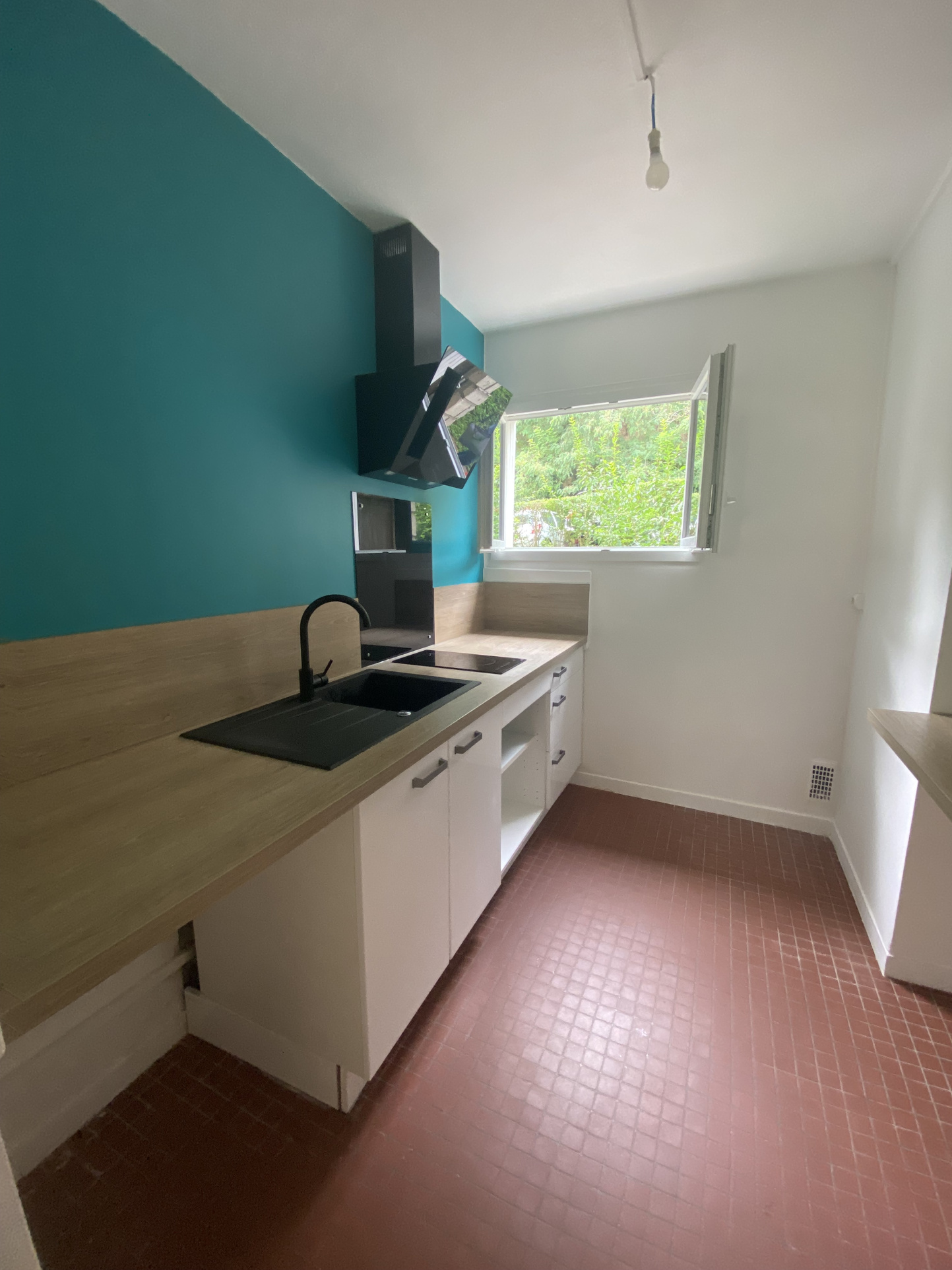 7' RER, résidence calme et verdoyante, appartement 2 pièces : cuisine aménagée (Plaques, Hotte), séjour, une chambre, salle d'eau, wc indépendant, dressing, rangements