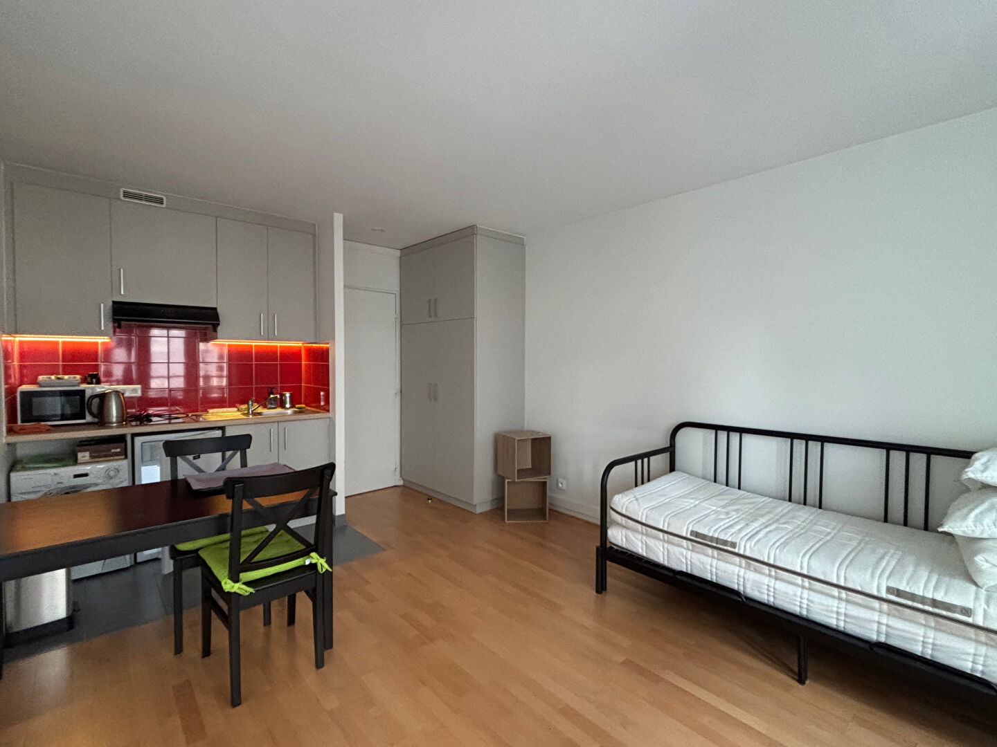 Grand studio de 29,73m² meublé avec coin nuit / coin bureau... avec entrée, cuisine équipée, coin buanderie, salle d'eau avec wc, grande pièce principale avec petit balcon, p...