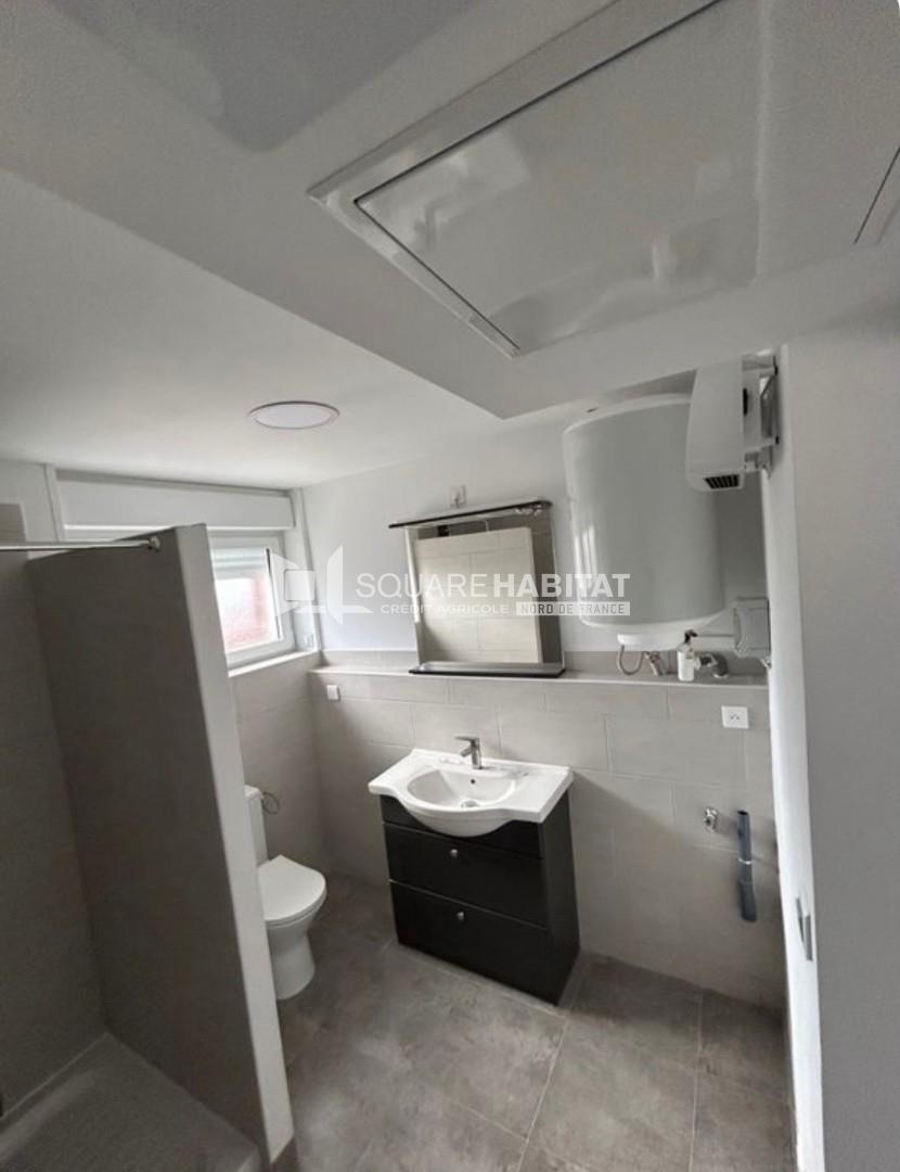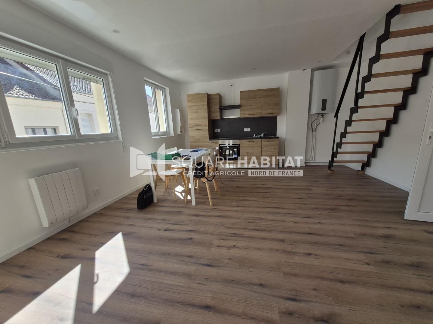 Auchel centre, à louer joli duplex entièrement rénové offrant une cuisine équipée ouverte sur le séjour, à l'étage, une grande chambre avec salle d'eau et wc. Le loyer comprend toutes charges (eau et électricité). Disponible de suite ! - Les informat...