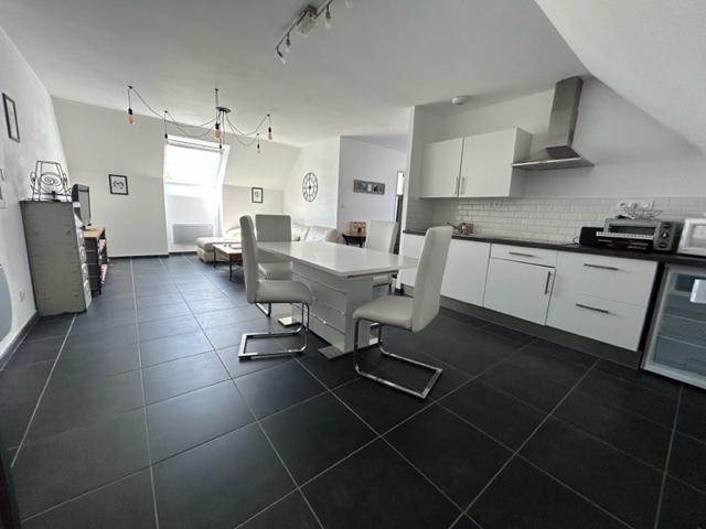 Centre ville de Saint-Omer, très bel appartement au 1er étage comprenant un salon, un séjour avec cuisine ouverte aménagée équipée d'une plaque de cuisson et d'une hotte, une chambre, salle d'eau et wc séparés. - Les informations sur les risques...