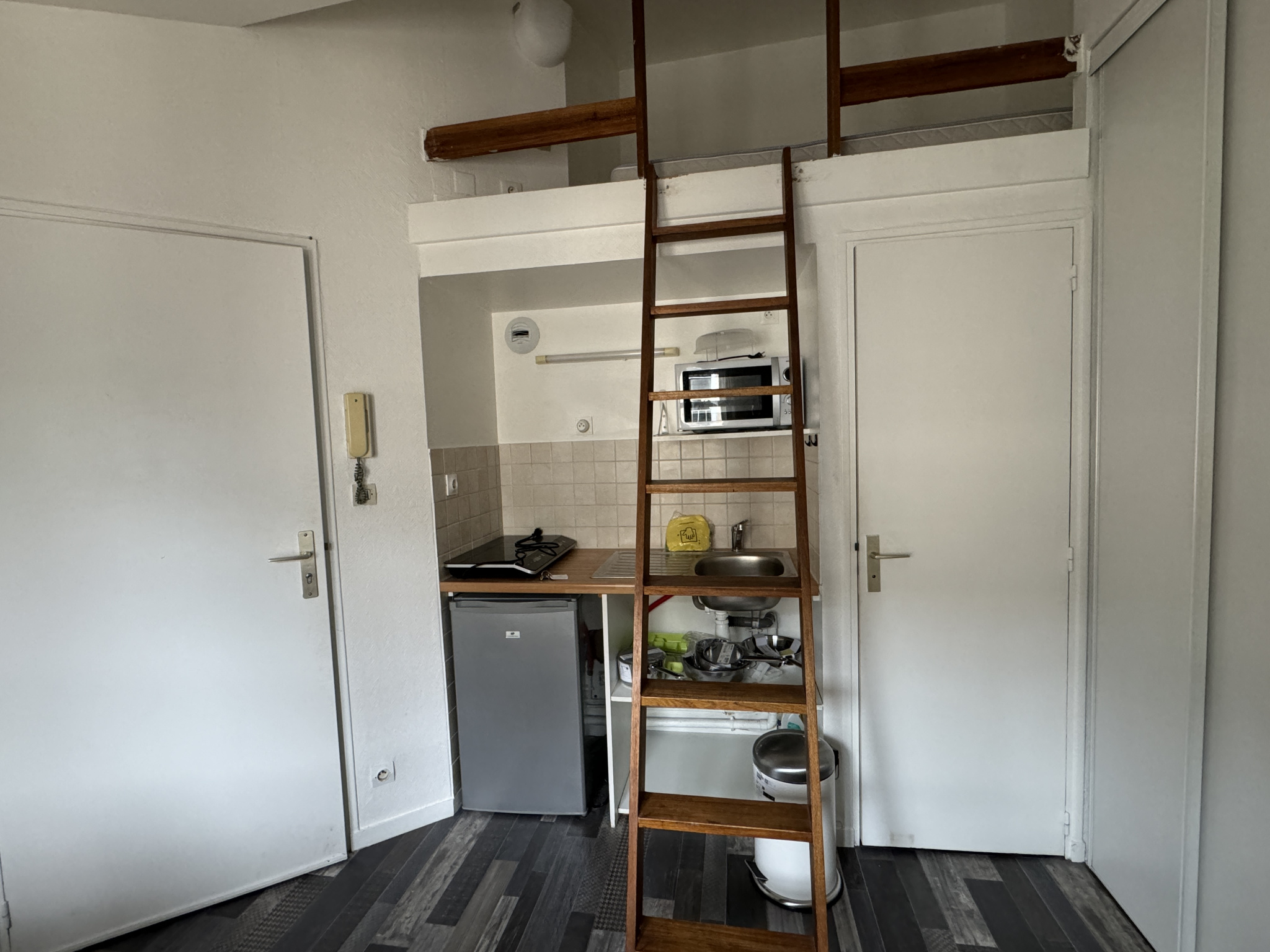 Appartement F2 de 25m2 comprenant au 1er étage : entrée, séjour, coin kitchenette, chambre et salle d'eau avec wc. Libre.