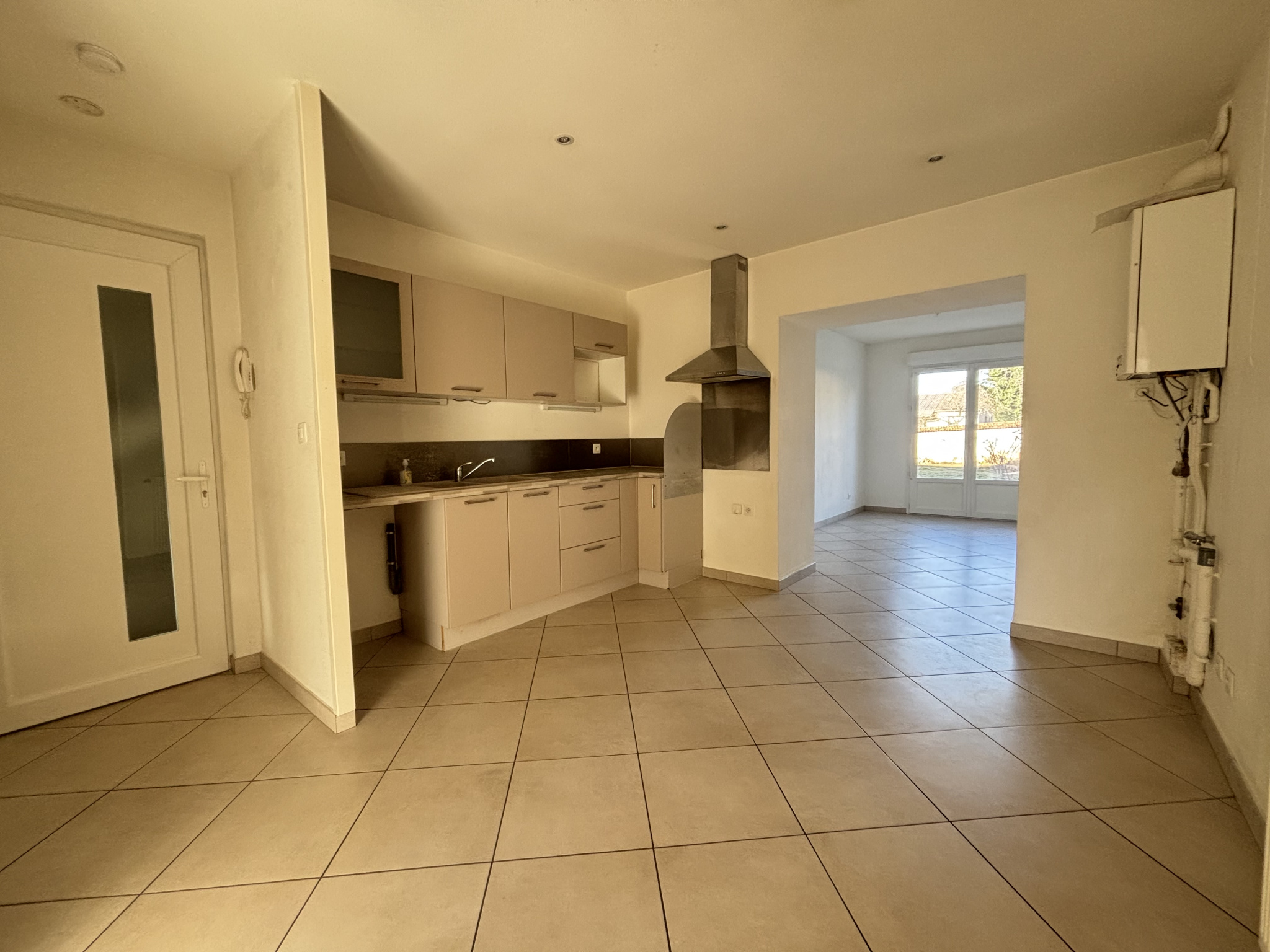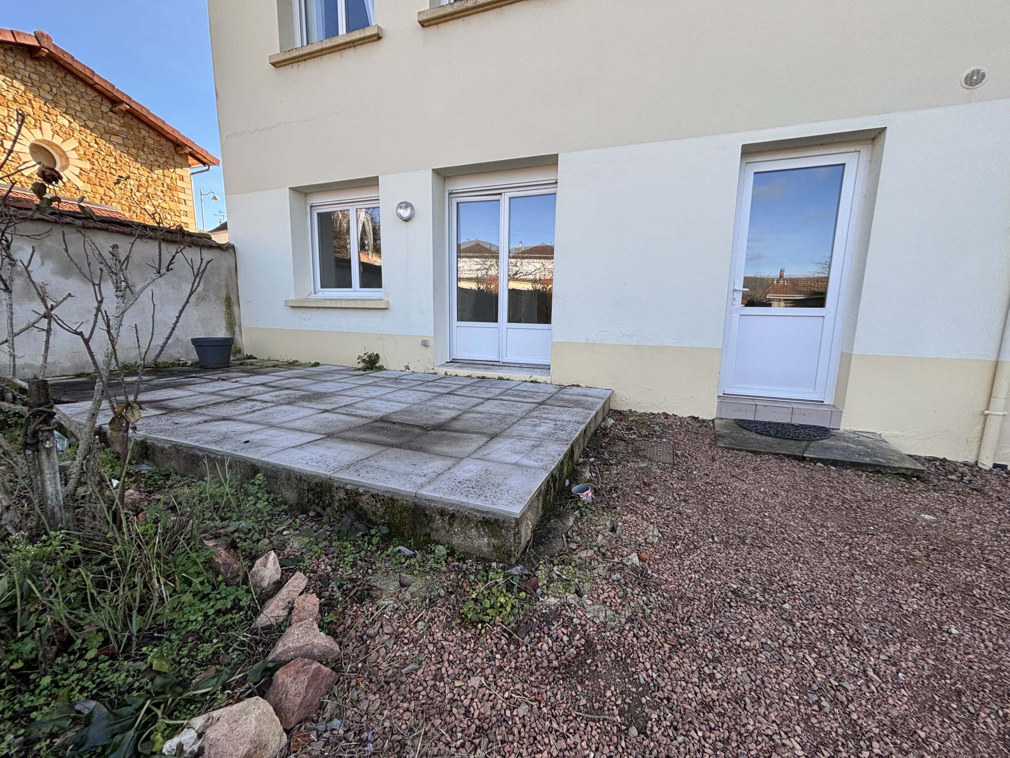 POUILLY-SOUS-CHARLIEU Route de Charlieu - Dans petit immeuble, appartement T4 traversant et en rez-de-chaussée d'une surface habitables de 65,22 comprenant entrée avec placard donnant sur cuisine équipée (meubles, hotte) ouvert sur salon avec accès terras...