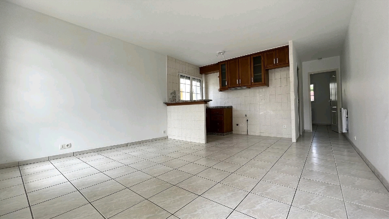 Entrée sur salon-séjour de 21.5m² avec cuisine aménagée, une chambre de 12m², salle d'eau avec wc.