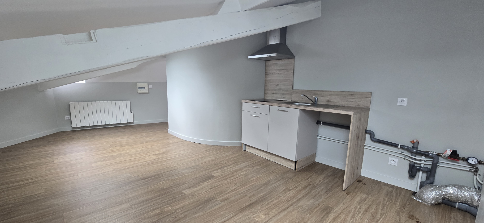 Appartement 2 pièces à louer à RIOM, centre historique à deux pas des commerces, quartier de l'Hospital Bel appartement au 3ème et dernier étage dans un petit immeuble entièrement rénové comprenant une pièce de vie avec cuisine aménagée (hotte et plaque i...