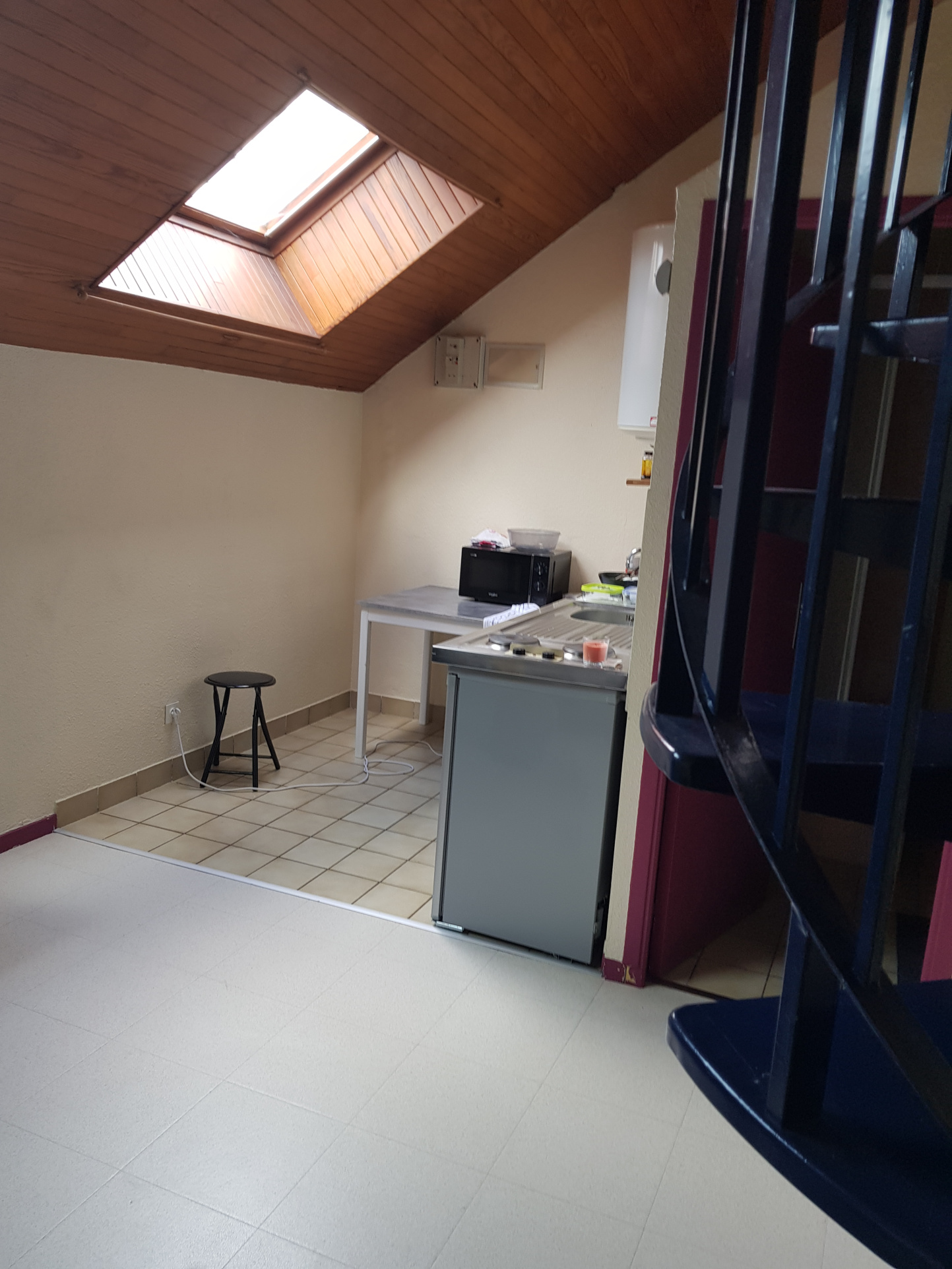 Entrée sur pièce de vie, cuisine ouverte equipée frigo et plaque de cuisson, salle d'eau/wc puis coin mezzanine pour l'espace chamb...