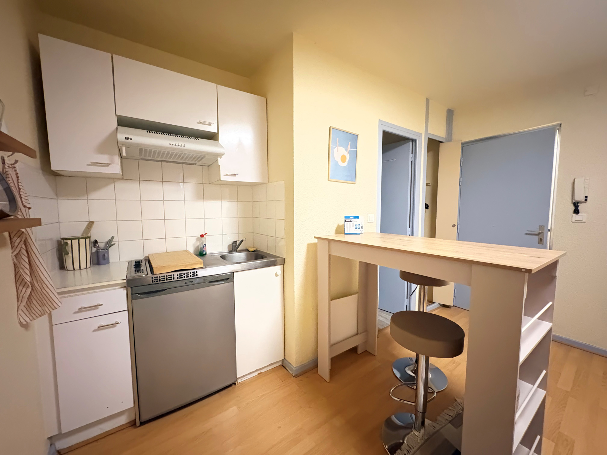 Il comprend une kitchenette équipée (éléments, hotte, plaque, frigo T...