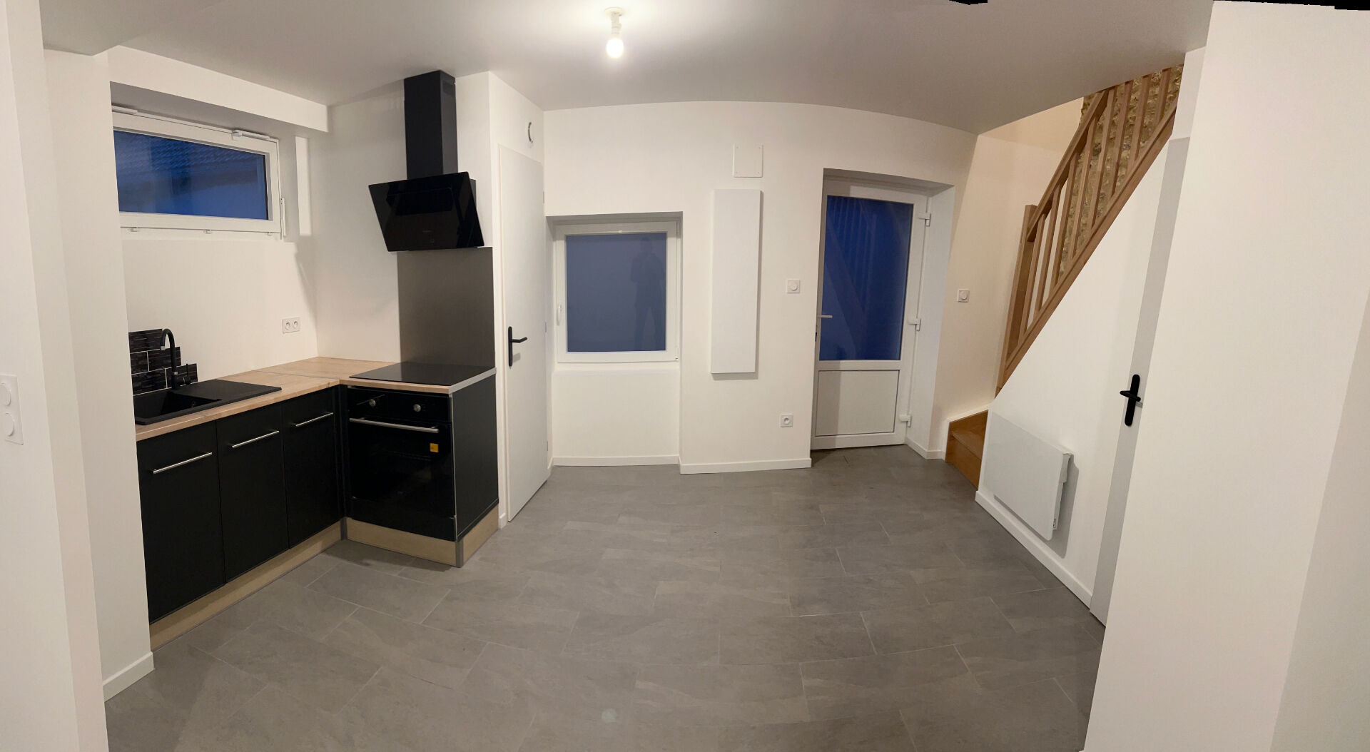 REF 7915 - T3 duplex dans maison mitoyenne situé à QUINGEY, au RDC: entrée sur pièce principale, cuisine équipée ouverte, WC séparé, à l'étage: dégagement, 2 chambres, salle de bains (cabine douche, meuble vasque, sèche serviette et WC), VMC individuelle,...