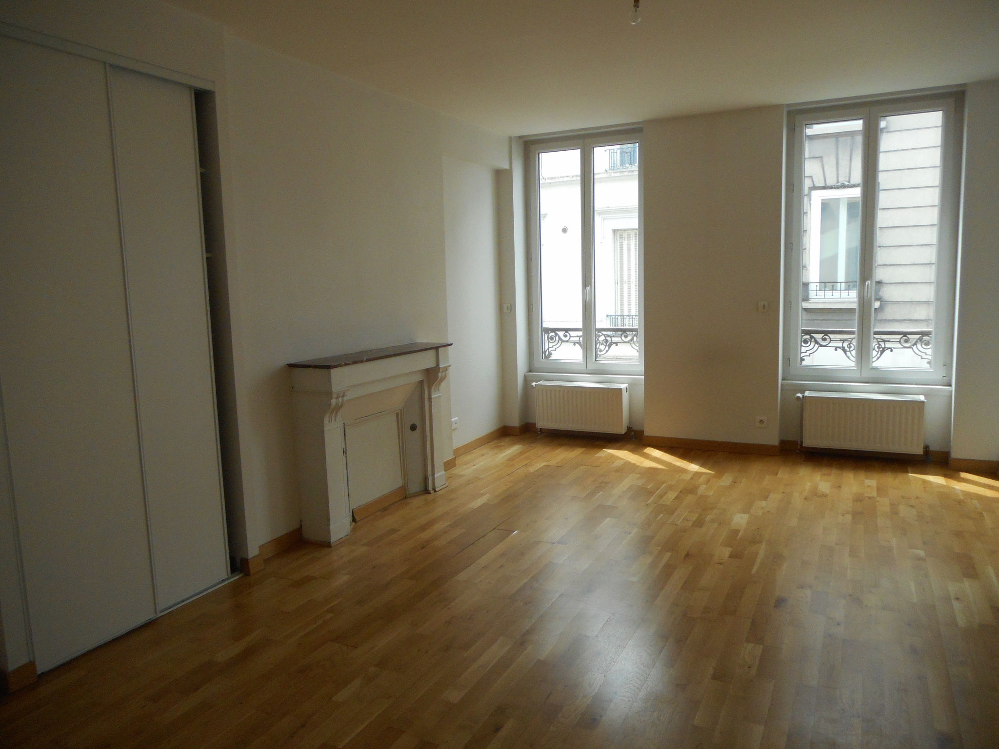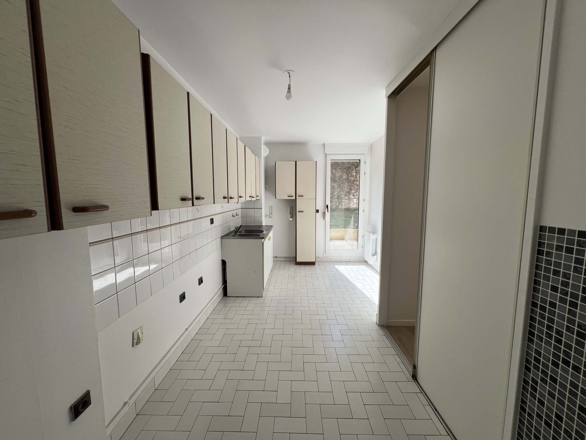 Hyper centre, un appartement T3 de 56 m2 au 1er étage offrant un séjour, une cuisine meublée et équipée, une salle de douches avec WC, un dégagement, 2 chambres et un placard.