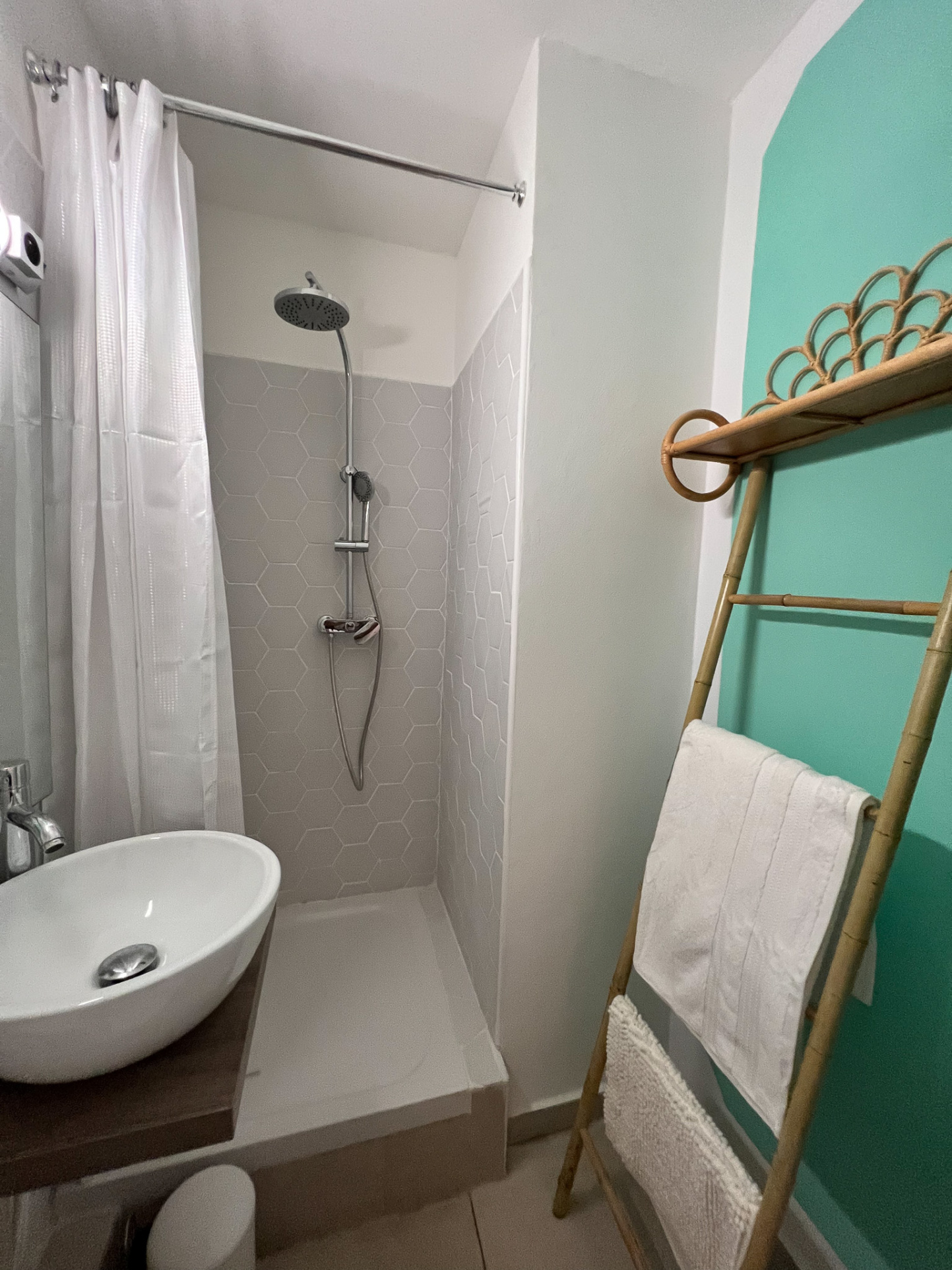 - Intérieur : studio meublé et salle de bain séparée de la pièce principale<...