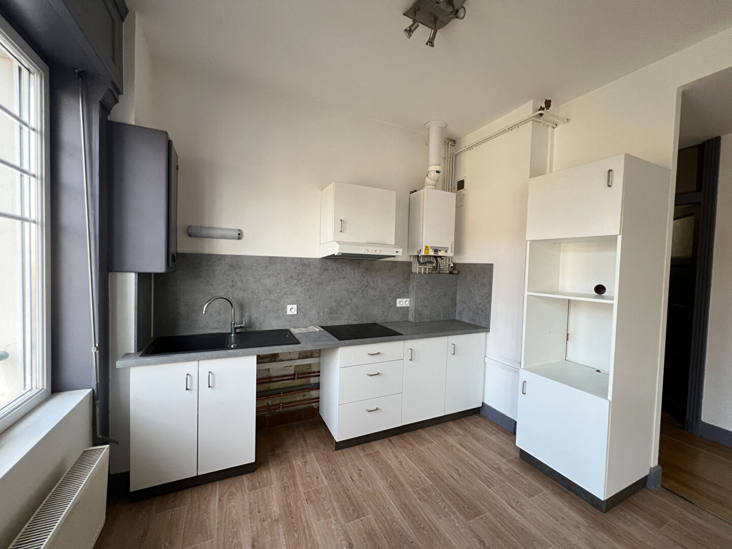 Cuisine donnant sur un grand séjour lumineux, 1 chambre, 1 bureau, salle d'eau et un WC.