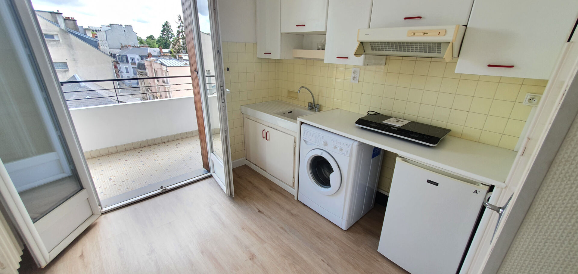 RODEZ : Appartement T1 exposé SUD/OUEST avec vue dégagée sur la Cathédrale de Rodez comprenant hall d'entrée, cuisine aménagée (placards hauts , bas, hotte aspirante, plaque de cuisson, frigidaire, lave-linge), séjour - coin chambre avec un balcon de 8,7...